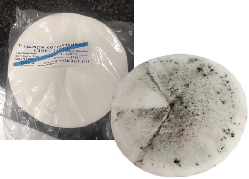 Далее пробы доставляют в лабораторию, растапливают при комнатной температуре, чтобы определить общий объем талых вод. Их фильтруют, чтобы оценить состав твердого осадка, то есть количество пыли, сажи и прочих частиц (рис. 2). В зависимости от задач определяется химический состав талых вод на предмет содержания в них сульфатов, хлоридов, гидрокарбонатов, нитратов, аммония, натрия, калия, кальция, магния, фосфатов, тяжелых металлов, а также уровень рН.