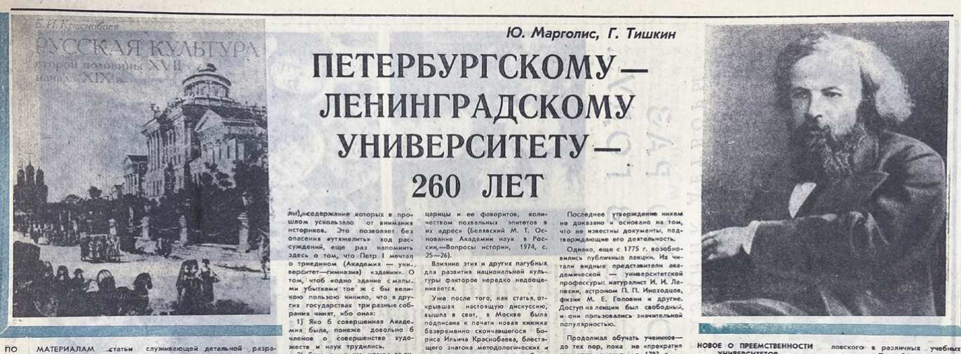 В результате этого научного сотрудничества появились основанные на новых фактах дискуссионно-провоцирующие статьи. В 1983 году в газете «Ленинградский университет», чрезвычайно популярной у универсантов, опубликовали статью «Сколько лет Петербургскому университету?». В 1984 году в этой же газете Григорий Тишкин и Юрий Марголис представили статью «Петербургскому университету — 260 лет». Тогда же в журнале «Нева» появилась статья «Сколько лет Университету на Неве?». Это вызвало дискуссию в Университете, в Петербурге и в других городах страны. Авторы статей стали очень популярными. Универсанты были рады результатам их поиска. Критики были обезоружены, так как суждения ученых были основаны на задокументированных архивных и литературных данных.