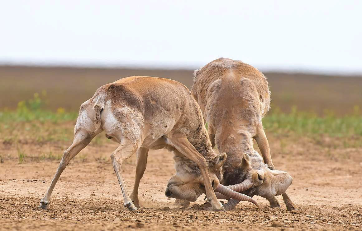 Однако интересовало ученых поведение сайгаков не только на водопое, но и вдали от воды. «Это было необходимо, чтобы мы смогли сравнить активность внутригруппового социального взаимодействия сайгаков у водопоев и вдали от них», — подчеркивает Карина Каренина. Поэтому зоологи фиксировали внутригрупповое взаимодействие носатых антилоп на равнинных степях, когда они находились минимум в одном километре от водопоев. Благодаря ровному ландшафту и возможностям современной оптики ученые могли хорошо видеть животных на расстоянии до 10 км, не выходя из укрытий. «Для сбора данных по частоте взаимодействий мы выбирали группы из 25–35 взрослых особей. При этом в каждой из них было не менее трех самцов старше одного года, — рассказывает Карина Каренина. — Поскольку наблюдение за животными велось в мае-июне, костяк группы (порядка 70 %) составляли самки с телятами. Также мы регистрировали общее количество особей в группах при подходе на водопой и выходе из него».