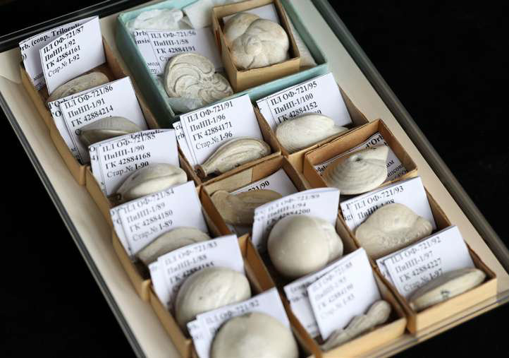В Палеонтологическом музее Университета представлены не только систематически разнообразные древние организмы, но и те окаменелости (фоссилии), которые являются важнейшими для определения относительного возраста осадочных пород (стратиграфии). К таковым, в частности, относятся фораминиферы.