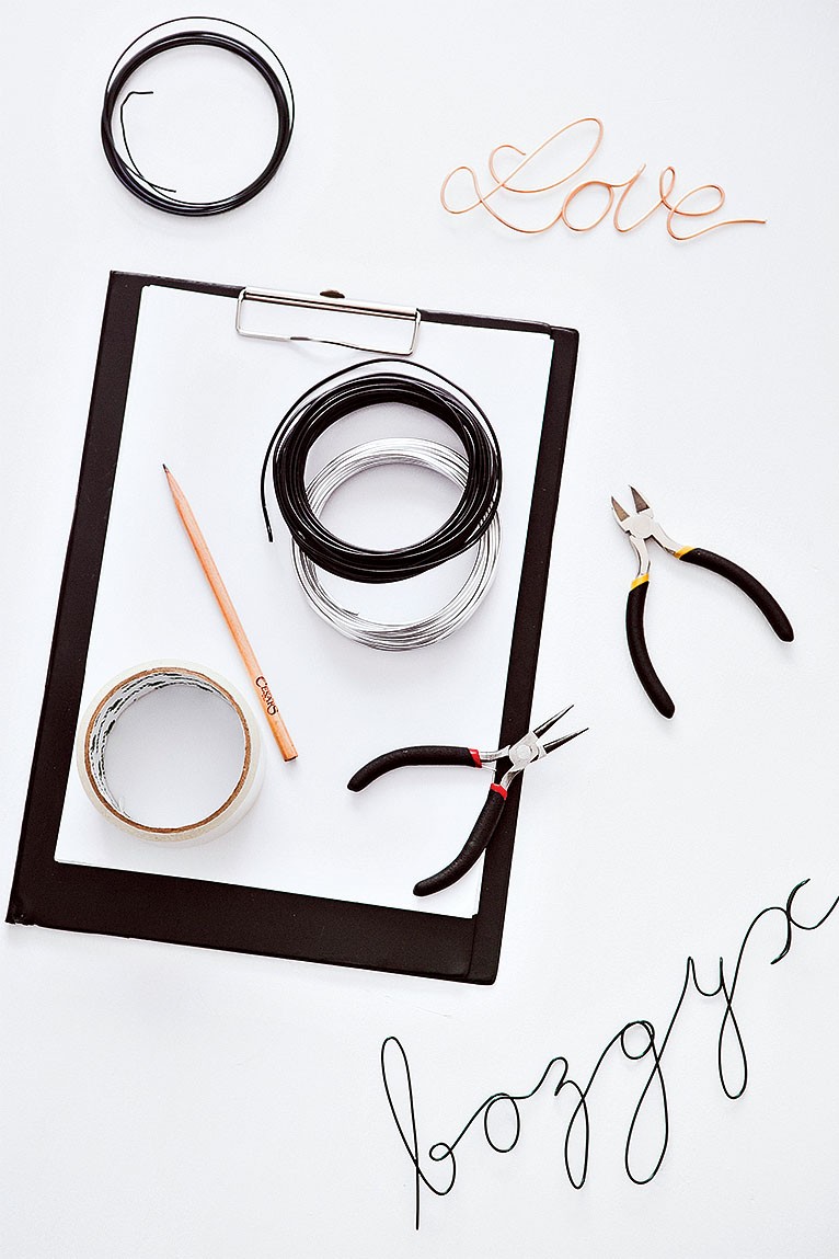 2. Отрезаем нужной длины проволоку. Выпрямляем отрезанный кусок руками. Проволоку прикладываем к написанному слову и сгибаем ее по обозначенным линиям. Если в процессе проволока деформировалась, аккуратно выправляем.