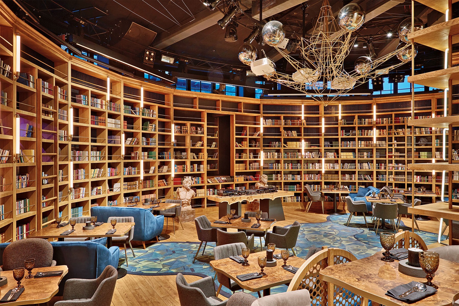 Идея места, объединяющего высокую гастрономию, бар, библиотеку, театр, лекционную площадку, появилась у Синиши Лазаревича, человека, который начинал когда-то клубную московскую жизнь. Для пустующего помещения в первом этаже конструктивистского здания на Космодамианской набережной, где сейчас находится филиал Университета имени Косыгина, Синиша придумал новую историю — какбудто здесь всегда была университетская библиотека. И вот собрание книг становится местом собрания людей, которые ценят хорошую еду, хорошую литературу, хороший театр, хорошую музыку.
