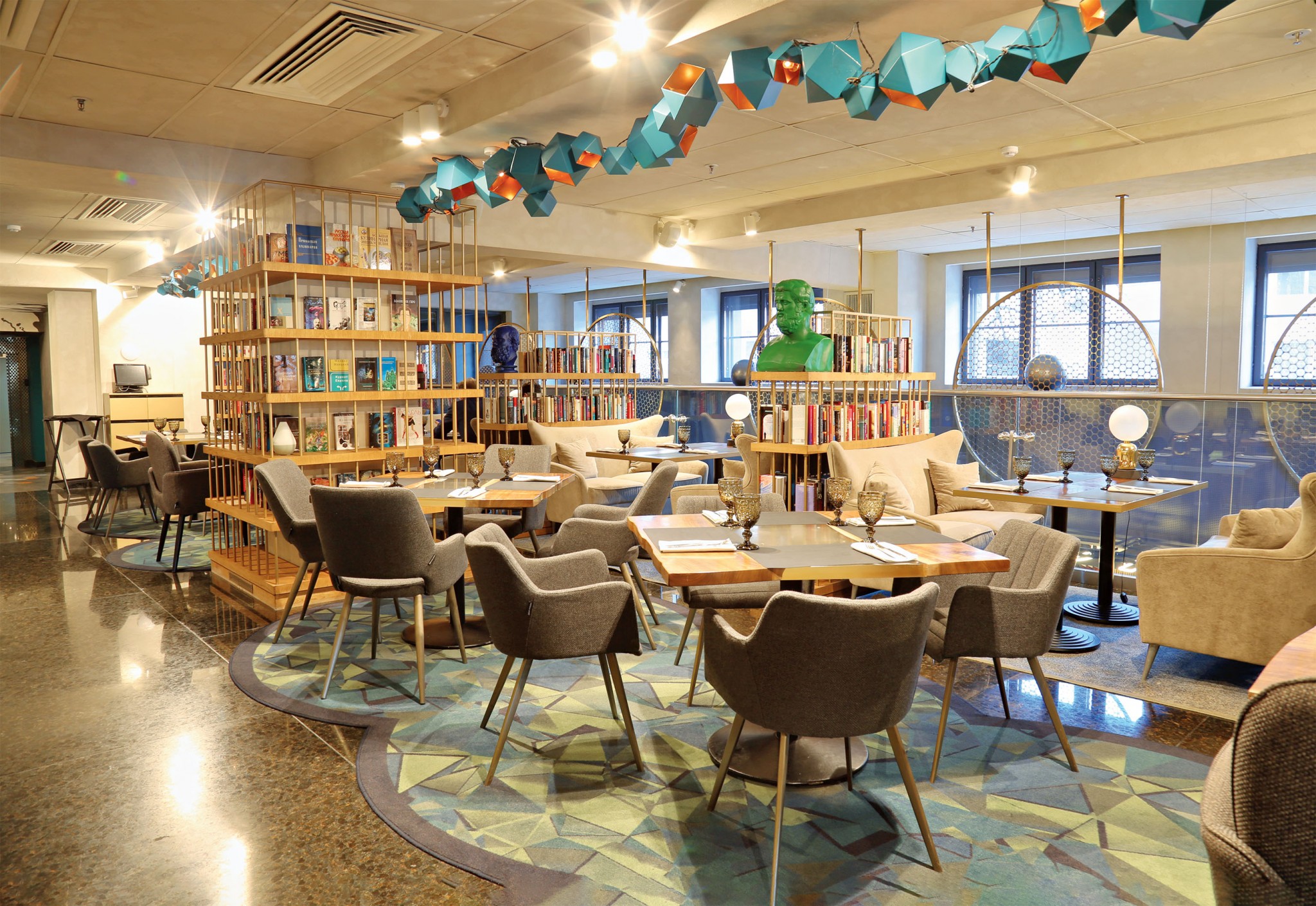 Но самое главное место — полукруглая огромная библиотека. В которой хочется потеряться: гадать по книгам с друзьями или взять с полки ту, которая зацепила взгляд, и сесть с ней в кресло, отложить телефон, забыть про рабочую почту и прочитать что-то длиннее поста в фейсбуке (соцсеть признана в РФ экстремистской и запрещена).