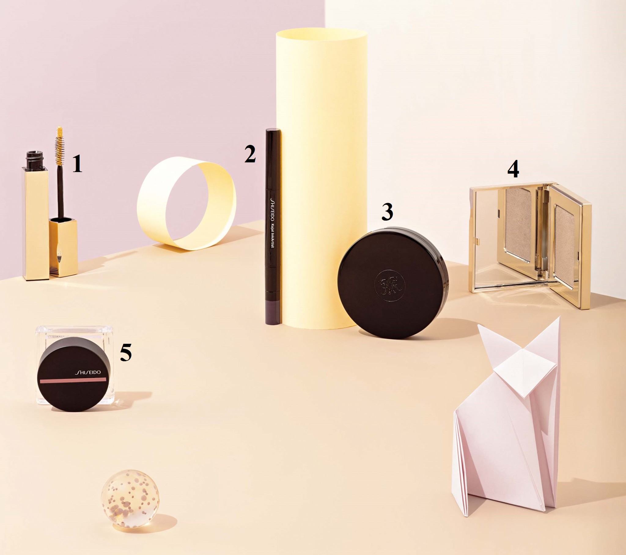 1. Топовое покрытие для ресниц с золотым эффектом Mascara Top Coat Or, Clarins — фантазируем и пробуем. 2. Многофункциональный карандашкаял InkArtist в цвете 05 plum blossom, Shiseido — растушевываем на нижнем веке, подчеркивая цвет глаз. 3. Палетка теней для век Raw Garden, Rouge Bunny Rouge — для матовых «смоки», как с подиума. 4. Мерцающая пудра для лица и декольте Illuminating Sculpting Powder, Clarins — блесток много не бывает. 5. Шиммер для лица, глаз и губ Aura Dew в оттенке 01 Lunar, Shiseido — наносим на внутренние уголки глаз.