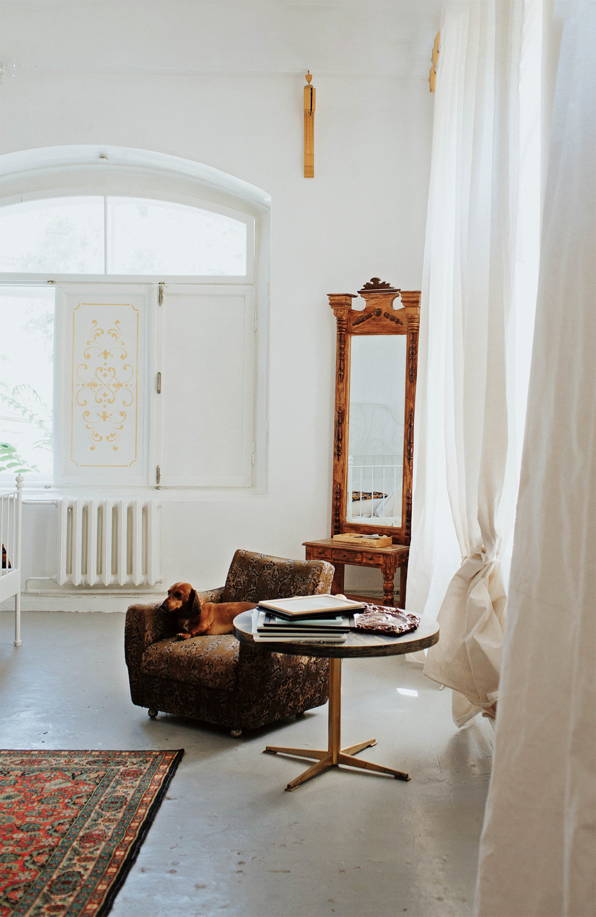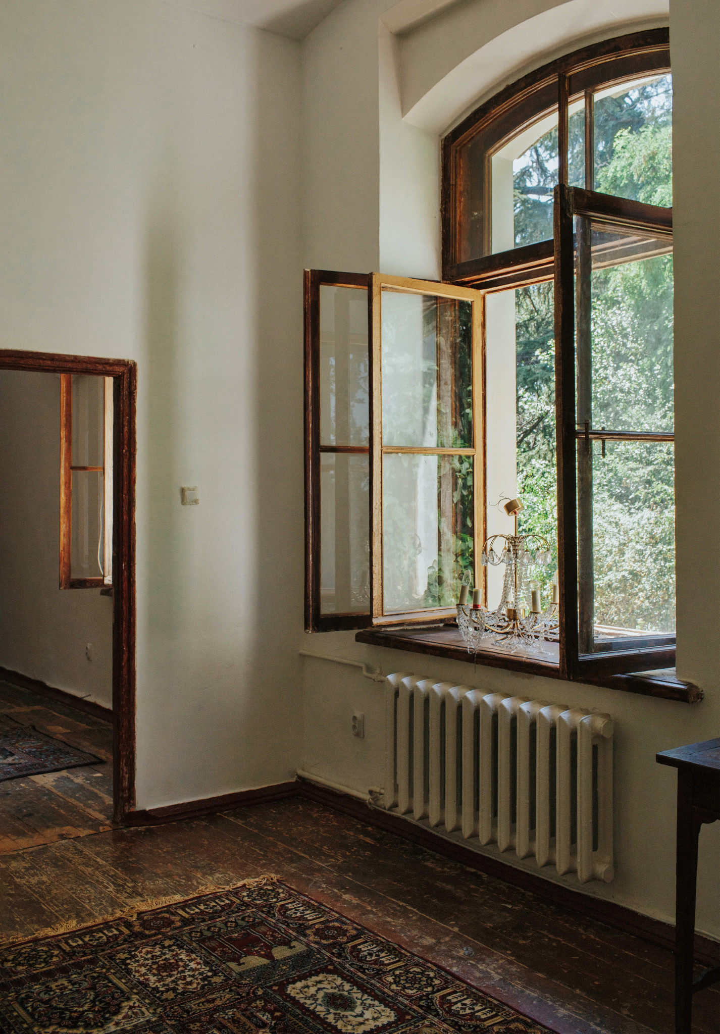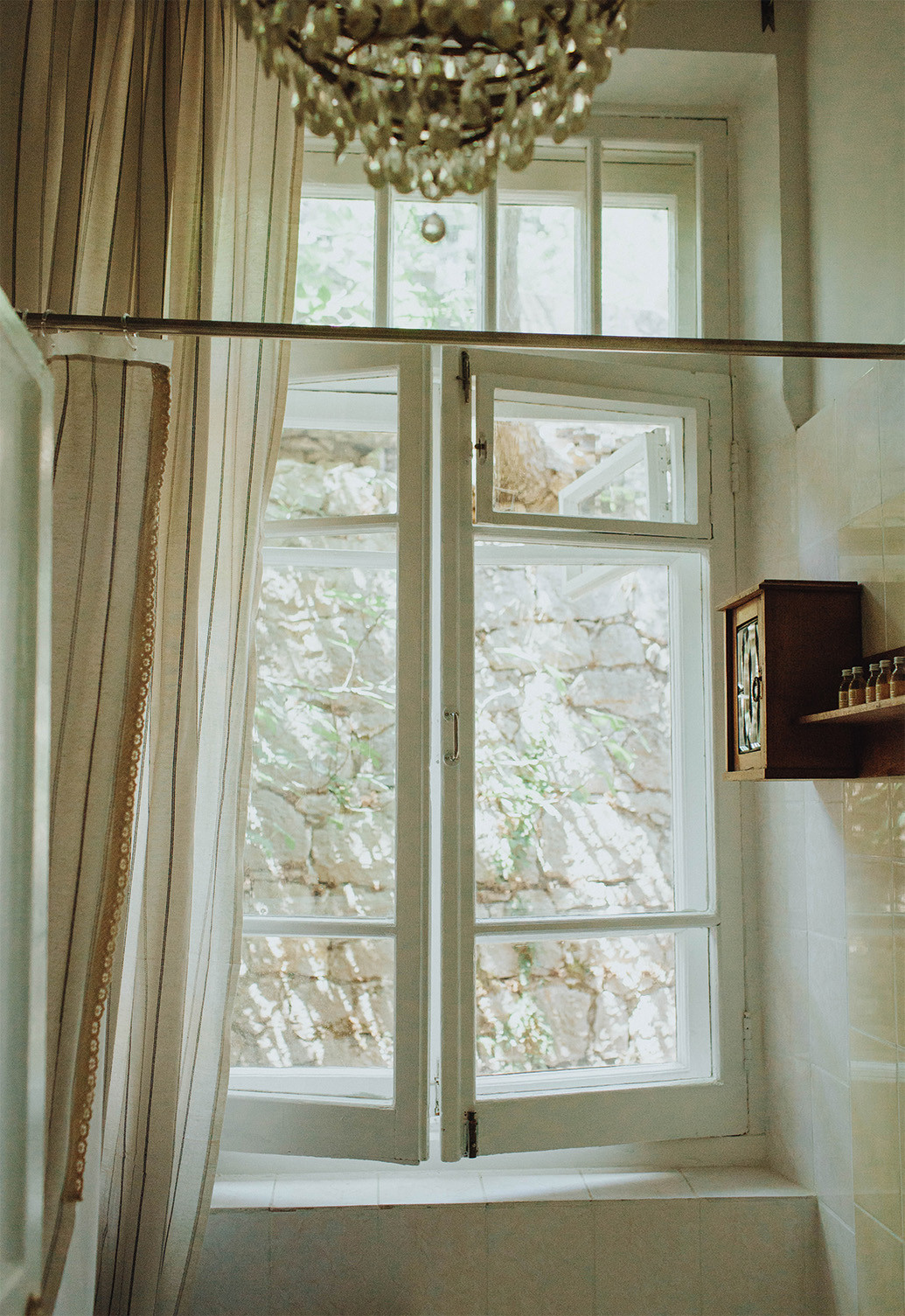 Двести лет истории застыли слоями краски на стенах, рамах и дверях. Обоями, штукатуркой, спрятанной под натяжными потолками, а под ней — тоскующие весь постсоветский период и вторящие своими изгибами морским волнам своды Монье. Ирина, Дмитрий и их дочка Даша слой за слоем очищали стены. Планировку императорских времен оставили прежней, благо комнат достаточно, чтобы из каждой сделать отдельный номер. Где-то стоит португальская кровать XVIII века с авито, где-то отлично сохранившийся комплект из шкафа и комода 1994 года, раздобытые на барахолке в Севастополе стулья, лаконичные белые кровати из Икеа. «Что за шторы? Кто расписывал стол? А делал витражи?» — практически на все вопросы получаю ответ: сами. Дизайн пространства авторства хозяев, естественный декор в виде теней и узоров света, достигающих пика своей причудливости на рассвете — особенность места.
