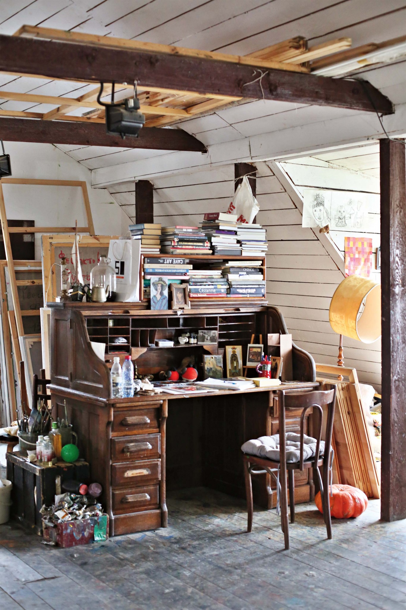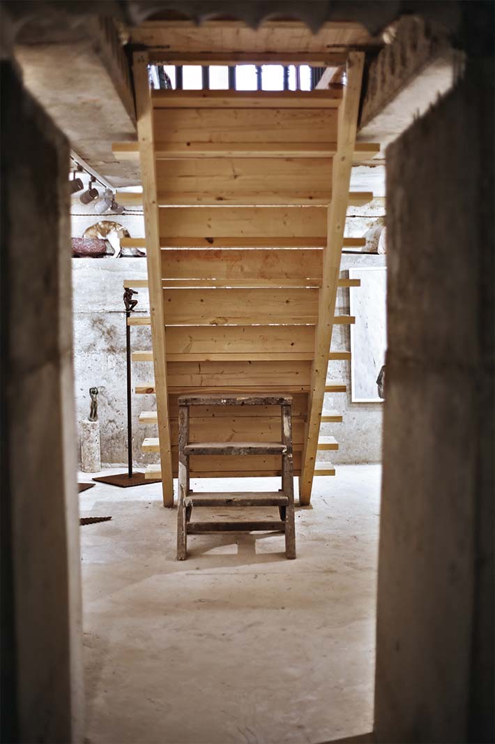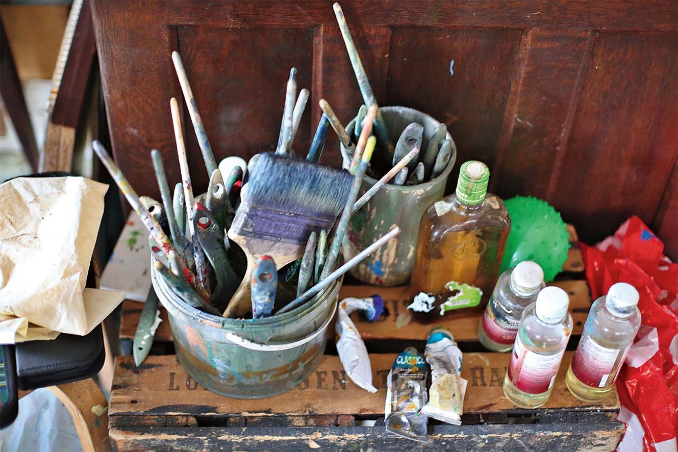 Дальше — покупка, сломанные стены, открывшееся пространство и вырытый подвальный этаж, которого изначально не было: «Я как‑то почувствовала, что галерея получится интереснее, если пространство будет развиваться, уходить вниз. На первом этаже живопись, а внизу я выставляю графику и мелкую пластику». Для любой работы нужно уединение. Как его найти маме пятерых детей? «Трудно было с маленькими, там не про работу мысли были, а просто, если тишина вдруг, если все уснули — лежишь и не шевелишься. Сейчас я ухожу в мастерскую, закрываю дверь, и никто ко мне не входит. Мне нужно полнейшее сосредоточение, внутренняя собранность, которая не всегда наступает. Часто перед тем, как подойти к холсту, я сижу часа два-три — договариваюсь сама с собой. Конечно, это все сложно. Для меня живопись — такая пытка постоянная».