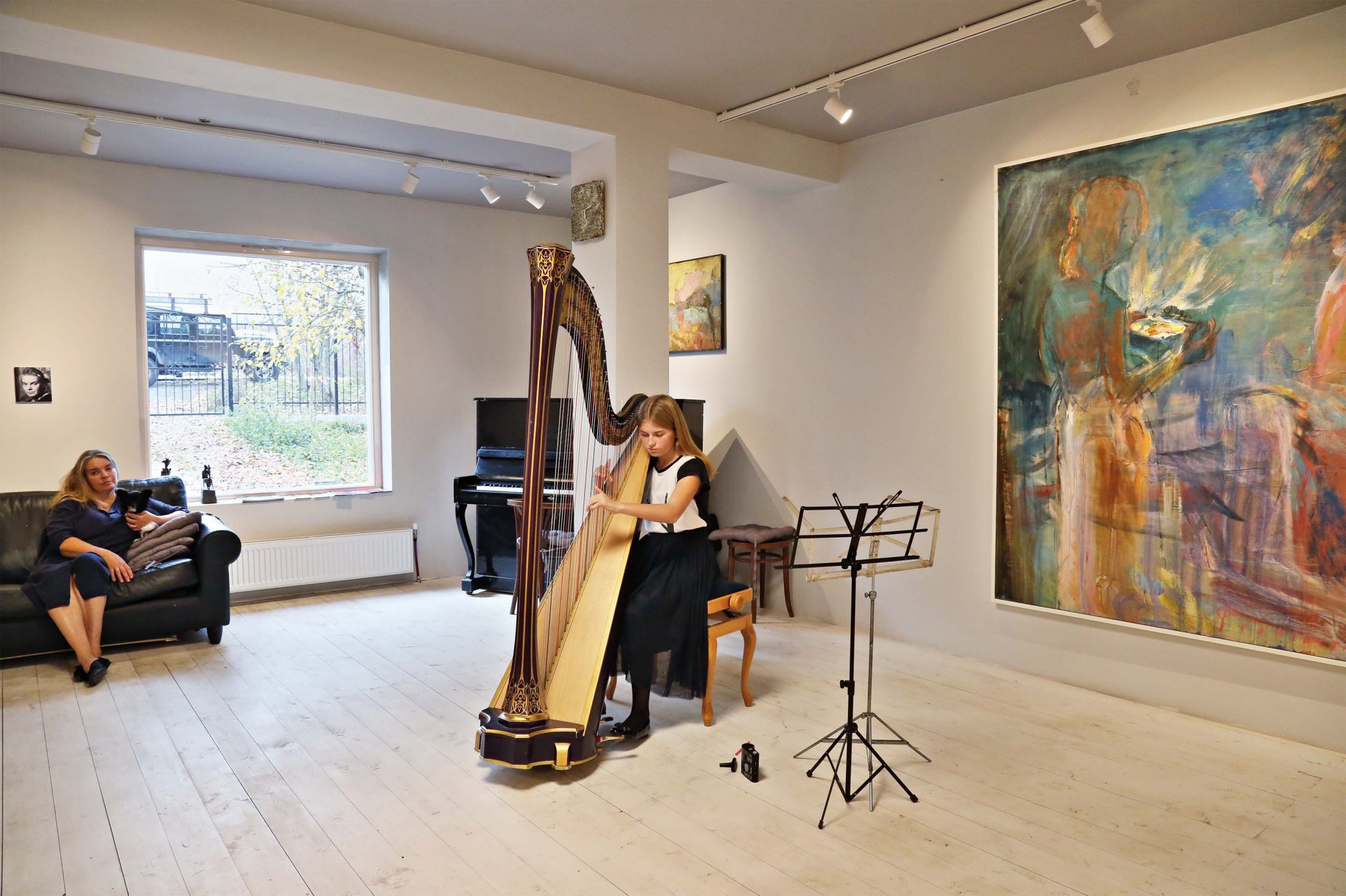 И еще в этом доме много музыки. Муж Аси — виолончелист и композитор Никита Кочергин. Не так давно он стал директором Музея С. И. Танеева в соседней деревне Дютьково. Младшая дочь Ксюша играет на арфе. Есть на ютюбе видео, в котором Ася пишет картину, и в это время звучит живой клавесин, на нем играет Александра Коренева. Огромный чистый холст, Ася в белом платке, по‑деревенски завязанном на затылке, сидит на полу, глаза закрыты. Краски, кисти, мастихин, тряпки, плошки — все готово. Встает, берет в руки толстую кисть. Первая линия, вторая. Появляется крыло клавесина, дальше женская фигура, алеет платье. Перформанс это? Наверное, да. Хотя Ася говорит, что не любит игру в «контемпорари арт». «Как определить, современнный ты художник или нет? Если ты согласился работать традиционными материалами в рамках холста, в двухмерном пространстве, это сразу откидывает тебя в прошлый век, и ты — несовременный художник». И вот что она делает потрясающе в этом видео — зачерпывает в конце рукой краску и доводит работу до ума. Как зачерпнула бы муку или начинку для пирога.