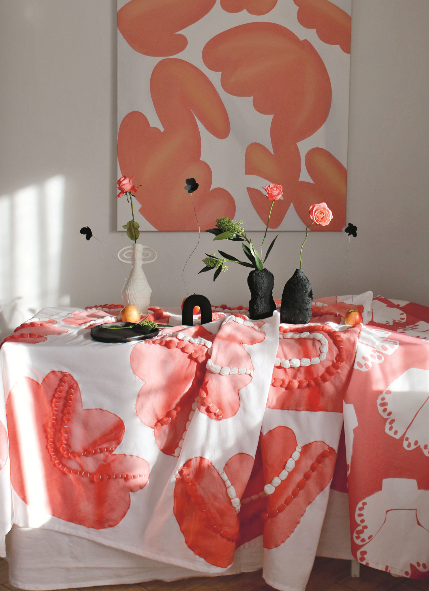 Дизайнер Даша Север (@ivankahome), давний друг нашей редакции, создает текстильные инсталляции, пишет картины, рисует паттерны для тканей собственного бренда, кастомизирует одежду, бесконечно рукодельничает с детьми, издает книги. Для весеннего номера, в ожидании пасхального семейного сбора, мы попросили Дашу сделать необычную скатерть. И вот что получилось.