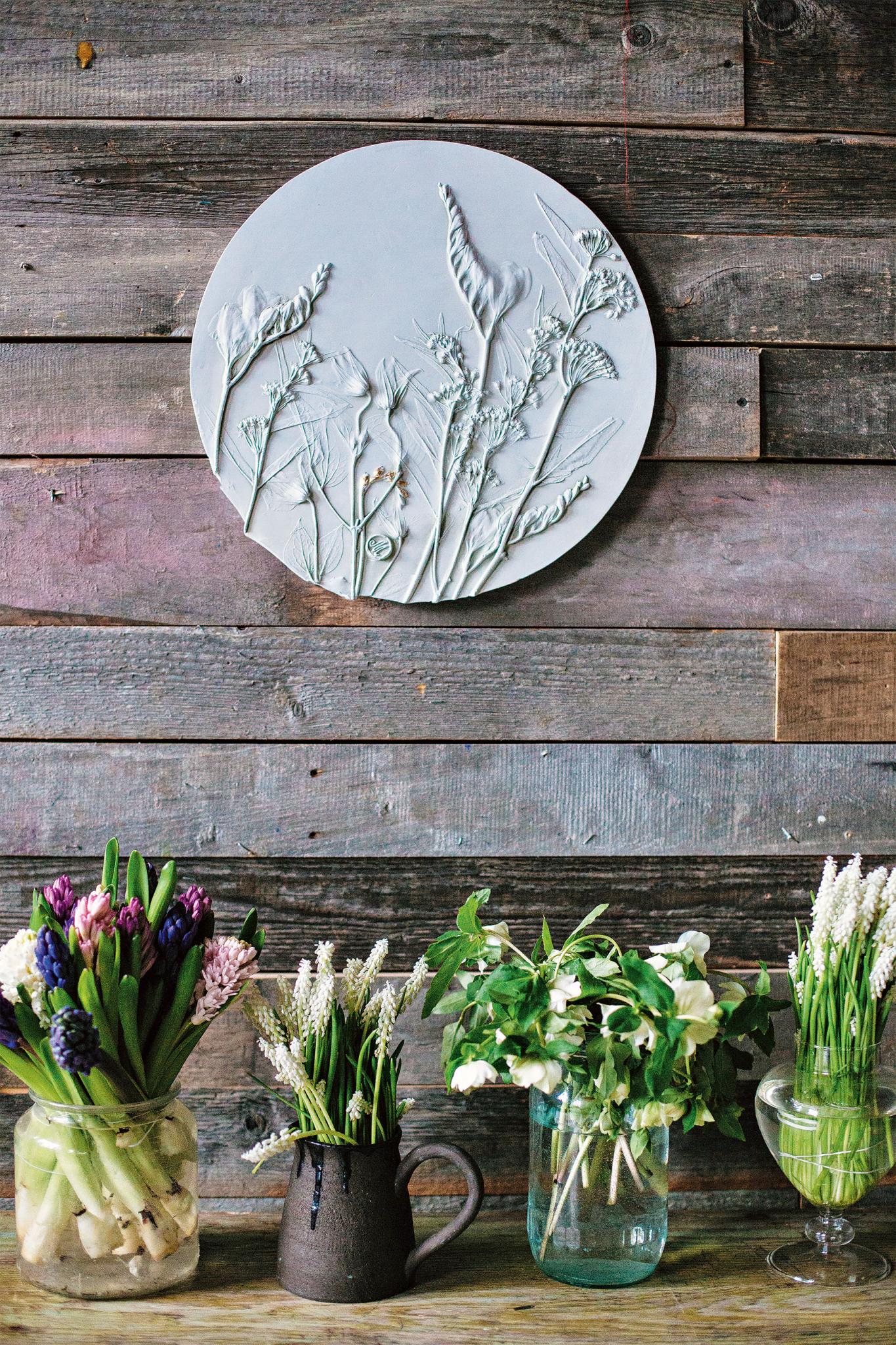 • 2,5 кг глины для лепки (товары для художников) • 500 г гипса для скульптурных работ (стройтовары) • Пластиковая емкость для смешивания гипсового раствора • Деревянная скалка • Раздвижной металлический бортик от формы для выпечки (диаметром 23 см) • Вафельное полотенце • Губка с абразивной стороной • Деревянный скульптурный стек («Товары для художников») • Проволока для петельки (если хотите повесить барельеф на стену) • Малярный шпатель • Пинцет • Любые живые цветы, главное — не сухоцветы.