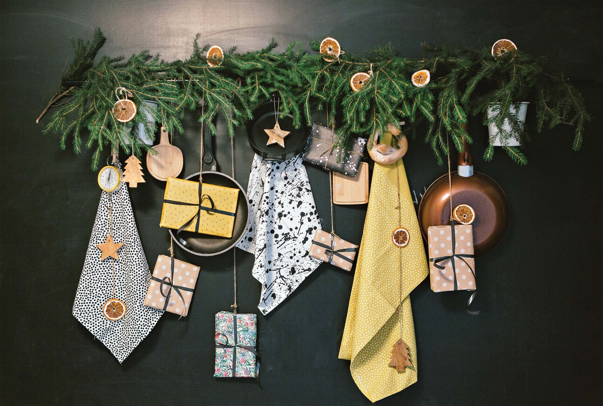 Длинная разлапистая ветка может стать и кухонным держателем для полотенец, и календарем одновременно — вешайте на нее подарочки, открытки,