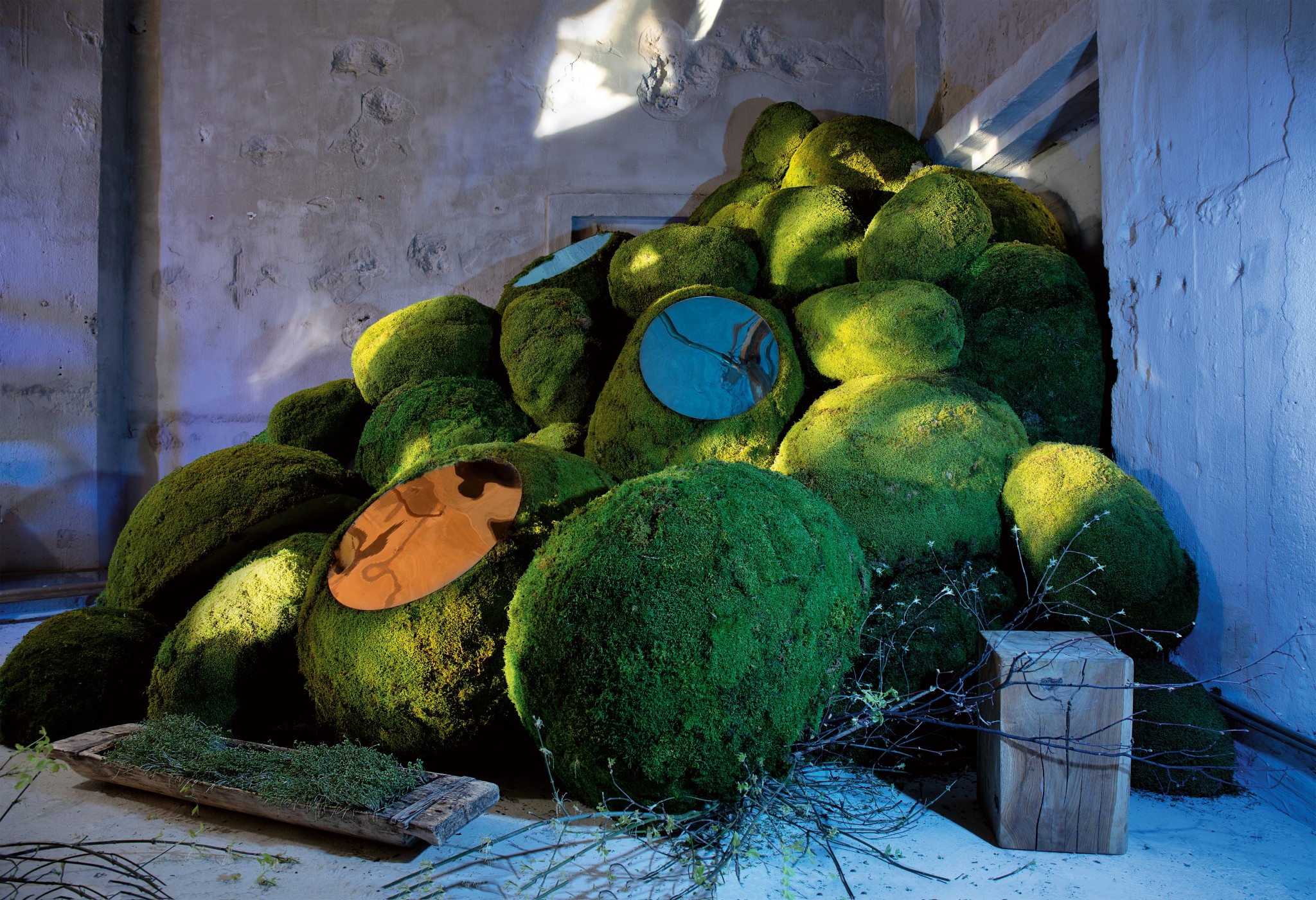 Мох, ветки, молодая и засушенная листва, а рядом предметы, созданные новыми ремесленниками: текстиль, мебель, аксессуары.