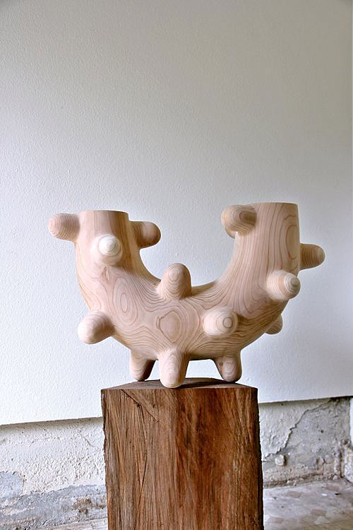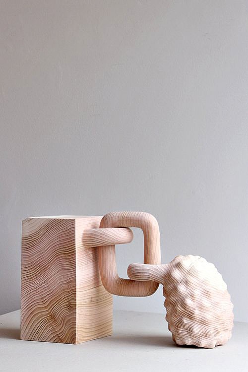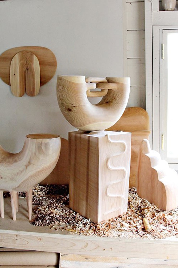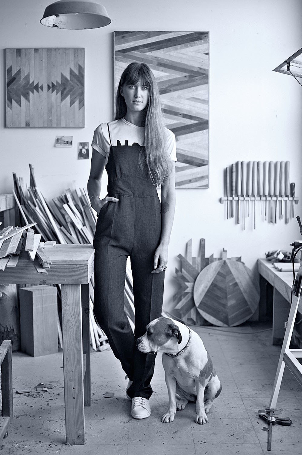 Несколько лет назад мы писали про Ариэль Аласко, худенькую, хрупкую девушку, которая делает мужскую столярную работу. В своей бруклинской мастерской Ариэль создавала панно из деревянных элементов — остатков паркетной доски, старых дверей, — складывая из них мозаичные изголовья кроватей, столешницы и панно. Техника Ариэль разлетелась по Пинтерест, ее стали копировать, пришло время двигаться дальше. Теперь она работает с объемом: делает аморфные деревянные скульптуры, подсвечники, ложки и гребни — не простую кухонную утварь, а арт-объекты. Ее предметы моментально раскупаются. Теперь Ариэль — признанный скульптор.