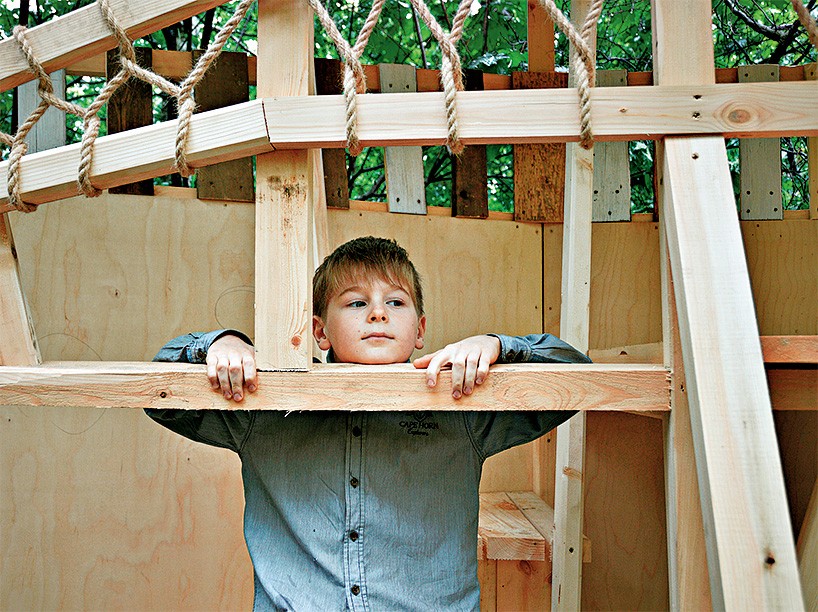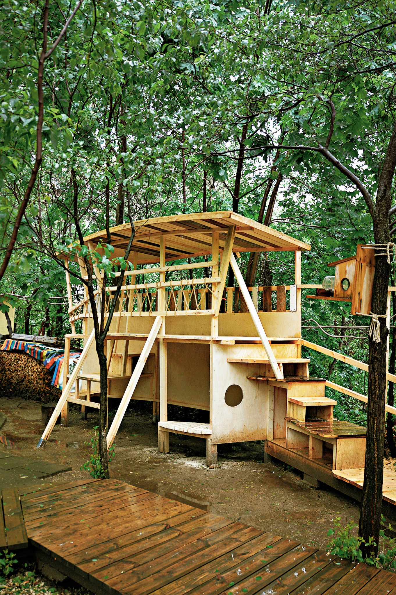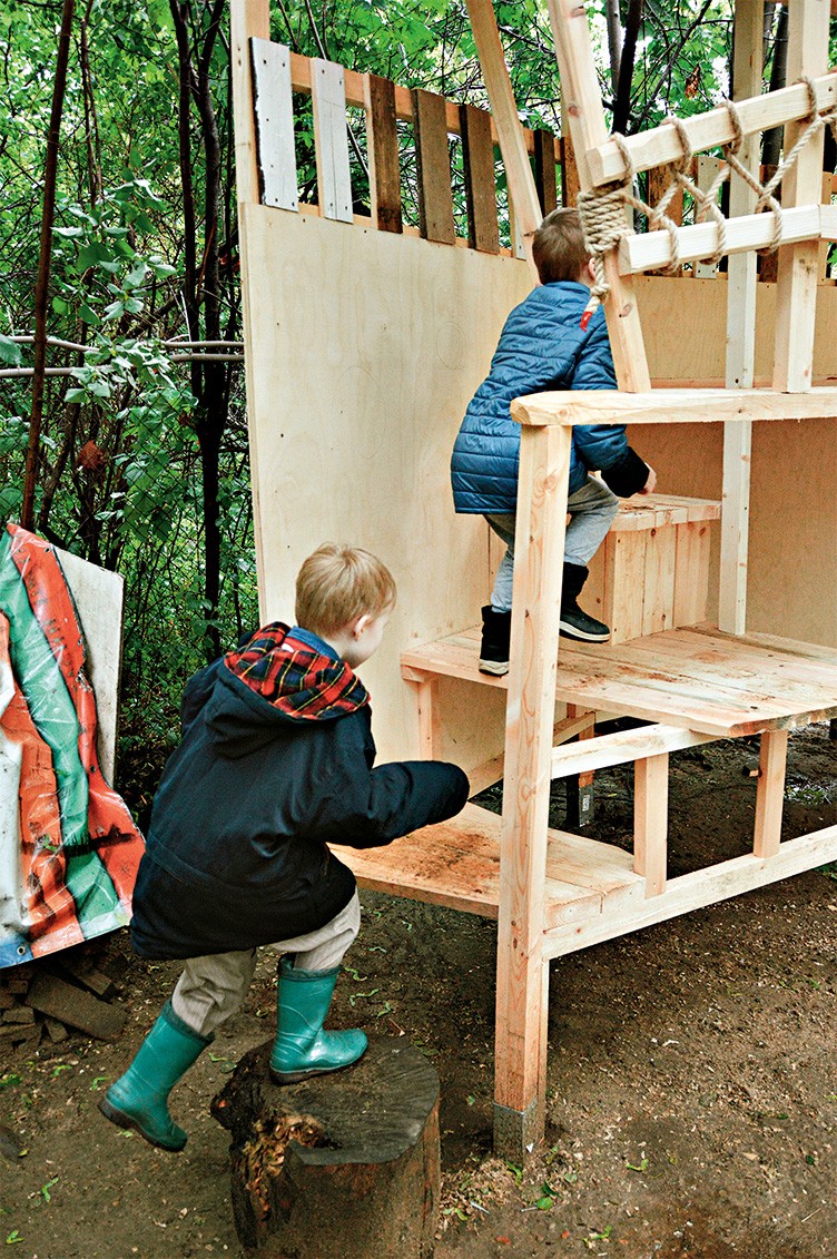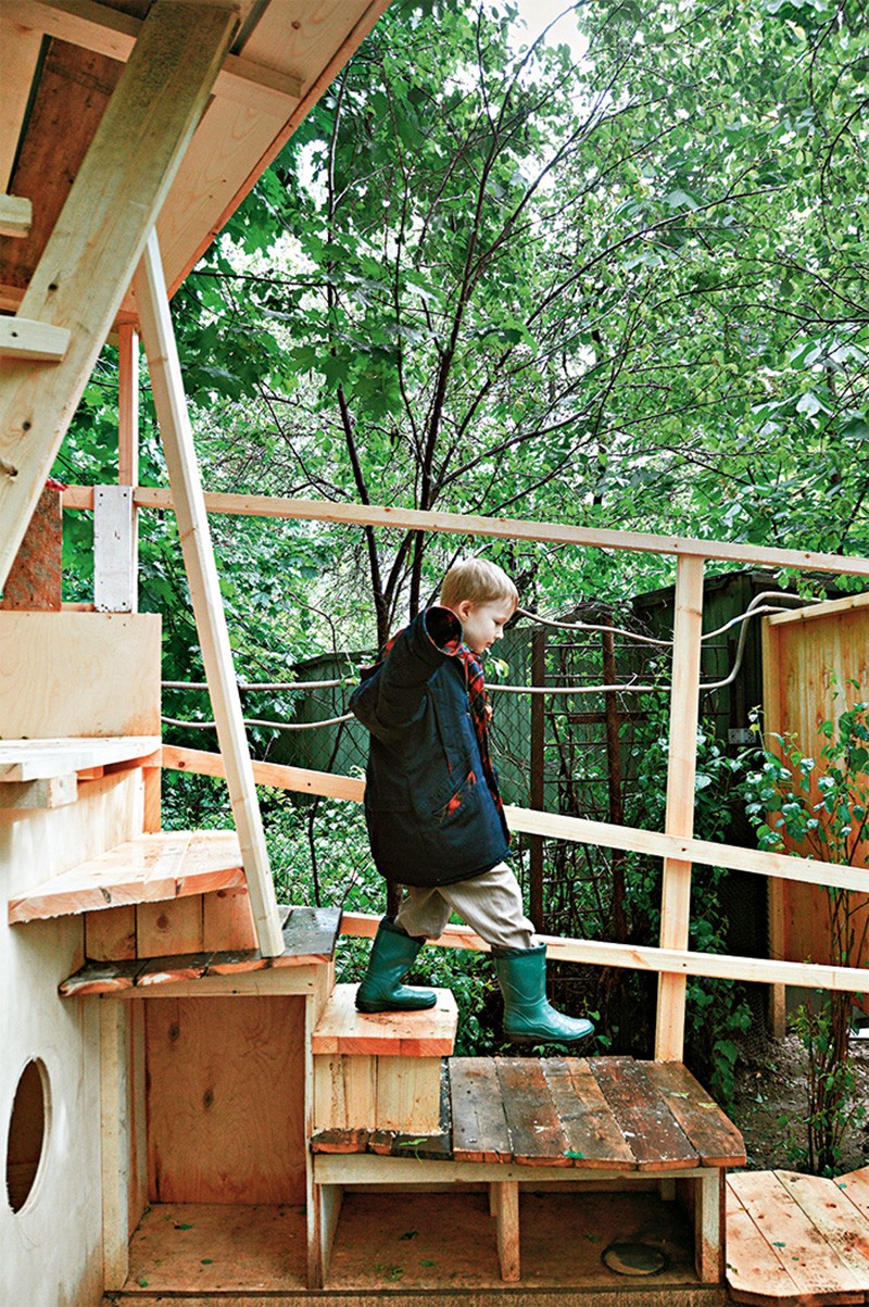 Небольшое пространство двора кажется больше за счет постоянно меняющихся ракурсов и разных уровней. Деревянные дорожки прочерчивают маршрут движения — траектория замыкается в круг. «Вы замечали, что, когда дети устают, они бегают по кругу? — говорит Юра Сырков. — Это самая гармоничная форма для детских пространств».