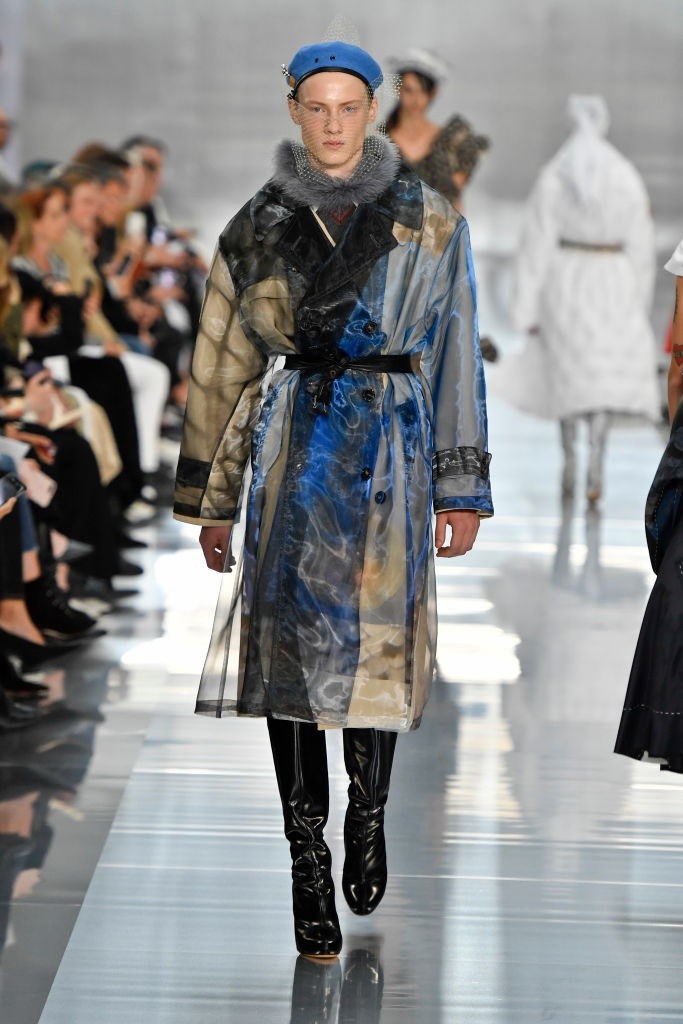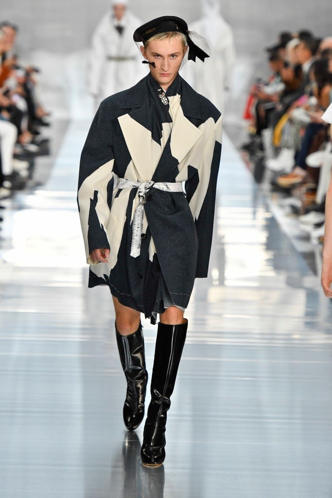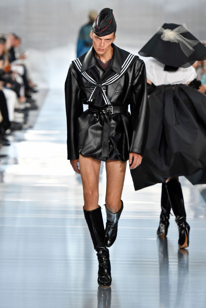 Креативный директор Maison Margiela Джон Гальяно продолжает делать упор на эпатажные наряды и не самую практичную, но эффектную деконструкцию. На этот раз Гальяно переосмыслил шинели времен Второй Мировой войны, одеяния матросов и сестер милосердия, а еще нарядил всех моделей — да, независимо от гендера — в сапоги на высоком каблуке. Отдельно посмотрите на бодрую походку модели Леона Дэйма, который закрывал дефиле и которому разрешили идти так, как ему хочется.