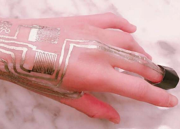 Уже не первый год ученые и исследователи экспериментируют с электронными устройствами, тем или иным образом наносимыми прямо на кожу человека. Это позволяет создавать на коже проводящие (а зачастую и весьма красивые) узоры, используемые для передачи сигнала или в качестве сенсорных панелей. Первые подобные работы основывались на подложках, наклеиваемых на кожу, а в последнее время все чаще используется прямое нанесение с помощью 3D-принтера. Изначально основная проблема с этим способом заключалась в том, что человеку трудно несколько минут держать руку или другую часть тела абсолютно неподвижной, а если рука двигается, то реально печатаемый узор отличается от запланированного. В последних работах эту проблему уже решили с помощью отслеживания и компенсации движения руки и даже с помощью закрепления принтера прямо на руке.