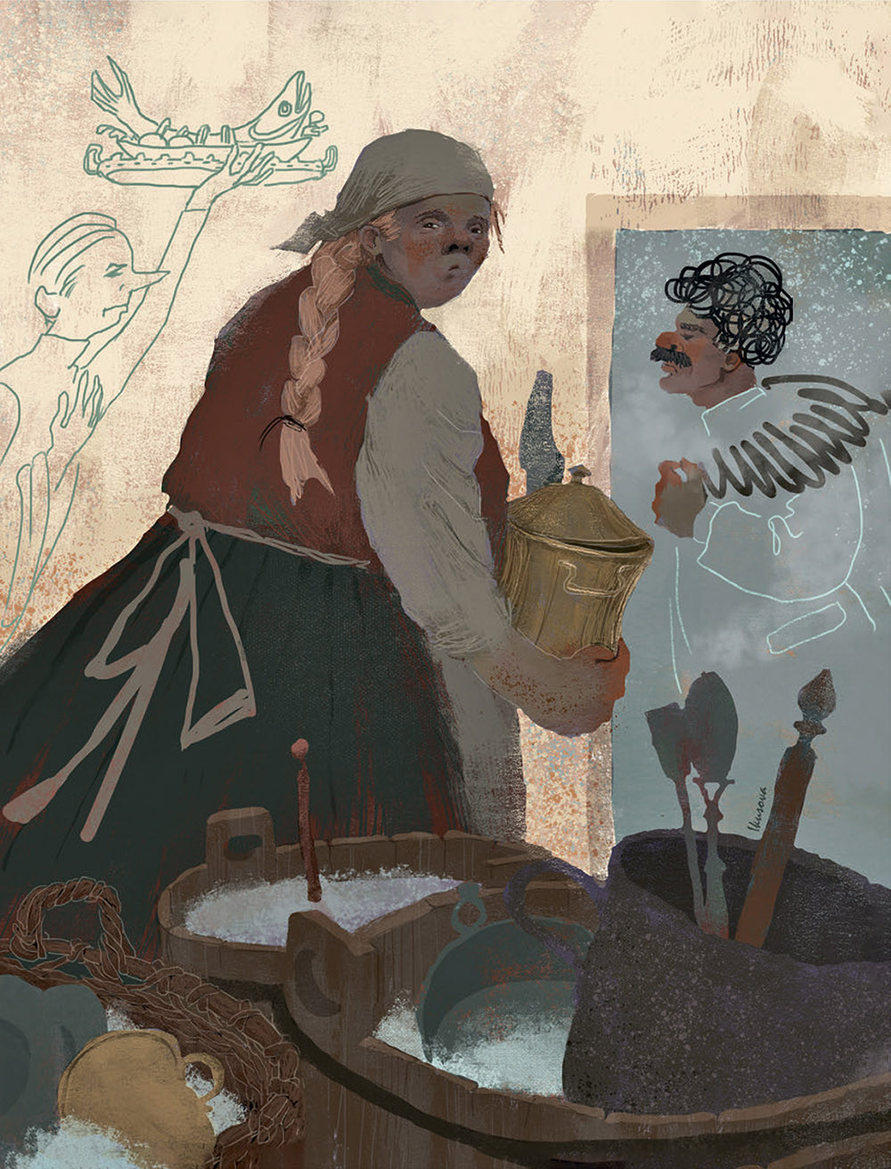 Печь Кулема любила. Громадная, что твой дом, с плитой и духовкой, она казалась Кулеме существом из другого мира. Огонь накалял конфорки — ровненько, докрасна, он же давал тепло духовке, бок которой согревал бак для воды. Все было придумано и сделано изящно, умно, все помогало рукам, высвобождало время. Говорили, что владелец ресторана, купец Дерюгин, выписал ее аж из Англии, за немыслимые, по слухам, деньги. Но Кулема деньгами не мерила, не умела. Ей нравилось, что печь была не только умная, но и красивая — по тяжелому железу вились, держась за лепестки, причудливые лилии, и каждое утро Кулема выметала золу, смешивала графит с каплей скипидара и сперва натирала этот гладкий литой сад мякенькой, точно из детского волоса, вихоткой, а потом полировала сверху большой жесткой щеткой. Стальные части начищались наждачкой, и для блеска — парафином. И надо было еще отличить железо от стали, понимать, что к чему.