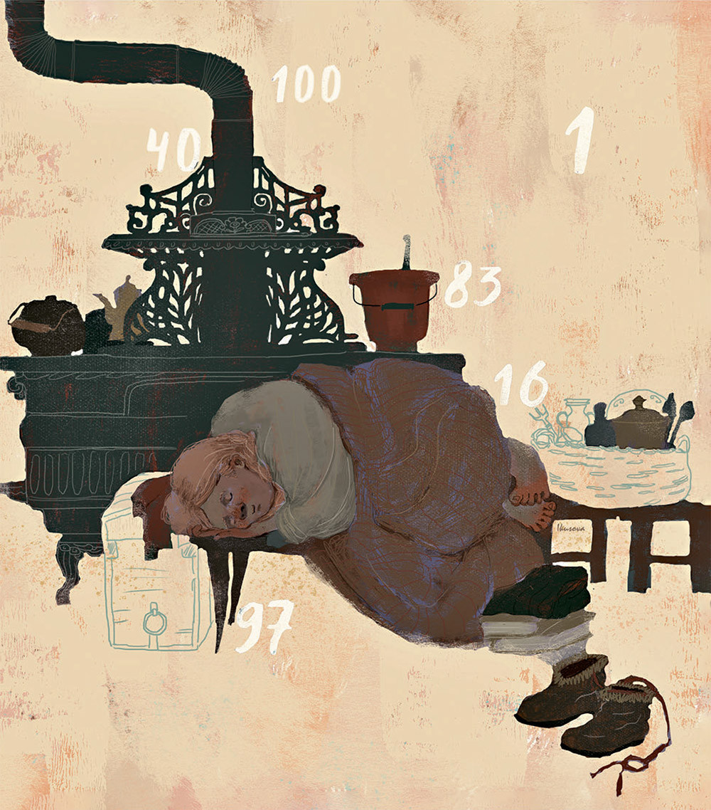 За печью, на тряпках, она и спала. В головах — сундучок. В сундучке — смена белья, платок нарядный (еще тятя дарил), стопка книжек да юбка суконная. Только дно и прикрыть. Так и жила. Ночью прикладывала то одну, то другую ладонь к печному боку, пила слабеющее тепло. Улыбалась. И начинала бормотать — тринадцать плюс три равно шестнадцать, и пятнадцать плюс один равно шестнадцать, двадцать три плюс семнадцать равно сорок, и тридцать семь плюс три равно сорок, девяносто семь плюс три равно сто, и восемьдесят три плюс семнадцать равно сто. Это была чудесная игра, четные числа никогда не подводили Кулему, но всегда она засыпала, не пройдя и полпути до края числового ряда.