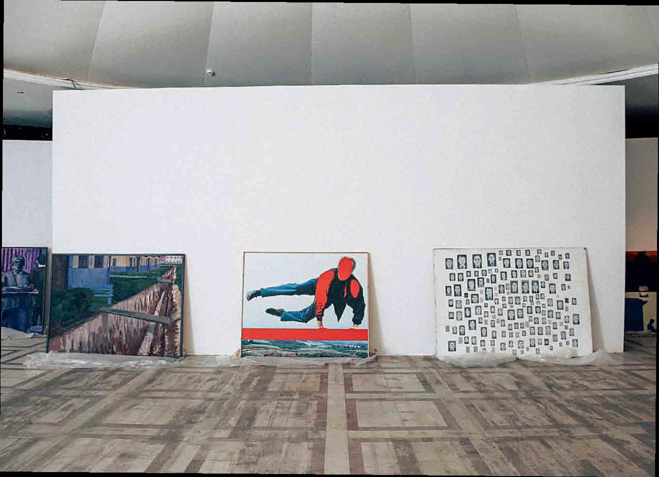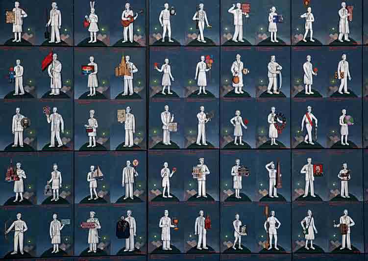 Идем дальше. Эпохальный диптих «фундаментальный лексикон» все того же Гриши Брускина, вошедший в учебники и монографии по новейшему искусству ХХ века. кстати, часть этого монументального труда была в свое время куплена на аукционе Sotheby’s Милошем Форманом, знаменитым голливудским режиссером чешского происхождения, автором фильма «Пролетая над гнездом кукушки». Весь диптих поделен на клеточки, в каждой из которых стоит по белому гипсовому монументу как бы в память об исчезнувшей советской Атлантиде. Невольно какие-то образы всплывают из детства. например, женская фигура с цветным телевизором «Рубин», или пионер, трубящий в горн, или космонавт с советским гербом на палочке, или портрет маленького Ленина в кудряшках. Перед нами самый подробный советский иконостас, который можно разглядывать бесконечно. Но уверен, что уже очень скоро он потребует подробных комментариев. Иначе никто ничего не поймет. Что это за предметы? Кто эти люди? Что означает лозунг «свободу узникам империализма»? Все надо объяснять.