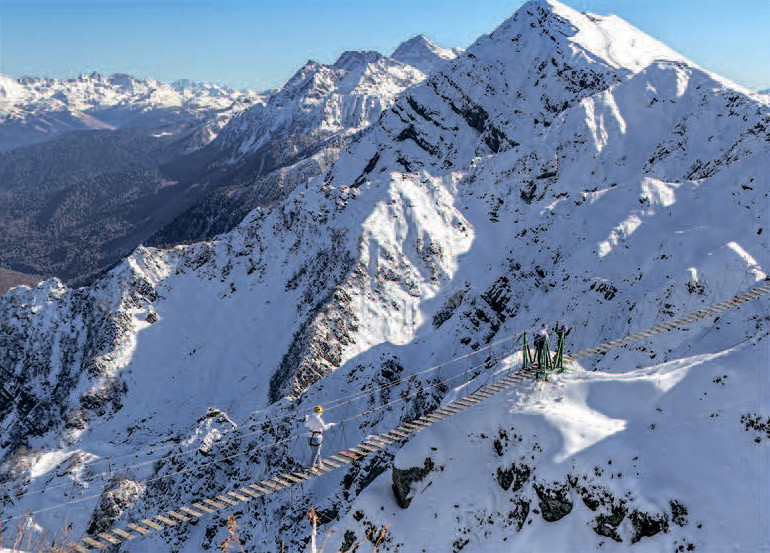 Подвесной мост на высоте 2200 м — одна из самых захватывающих смотровых точек курорта. Панорама Кавказских гор, долина реки Мзымта — виды, ради которых стоит пренебречь страхом высоты.