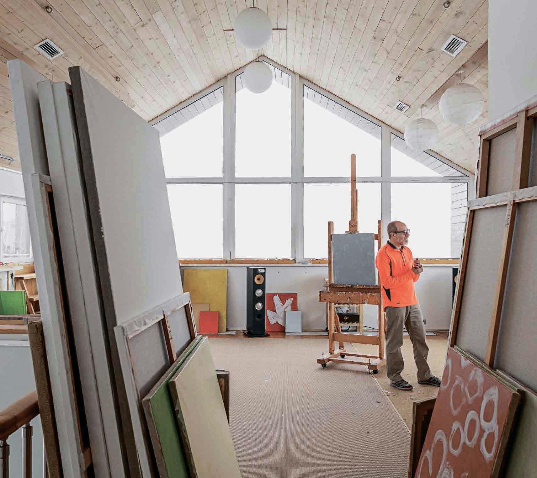 Выяснилось, что Гутов действительно давно стал подмосковным жителем. Несколько лет тому назад он приобрел дом в поселке Южная Долина, что в девяти километрах от МКАД, и там устроил себе мастерскую. Выбирается он теперь в столицу крайне редко, если только по неотложным делам. Мне захотелось взглянуть, как живут актуальные художники, и Гутов любезно согласился принять меня вместе с фотографом Михаилом Лоскутовым. Приезжаем. Сонная тишина, ряд аккуратных таунхаусов, коттеджей и малоэтажных домов. Идиллическая роща, темнеющая вдали. Похоже на пригород мегаполиса где-нибудь в Северной Европе. Лаконично, стильно, функционально. Пять минут до ближайшего гастронома, три – до последней резиденции вождя мирового пролетариата Горки Ленинские. Туда Гутов зимой регулярно наведывается на лыжах, благо в знаменитый парк пускают беспрепятственно.