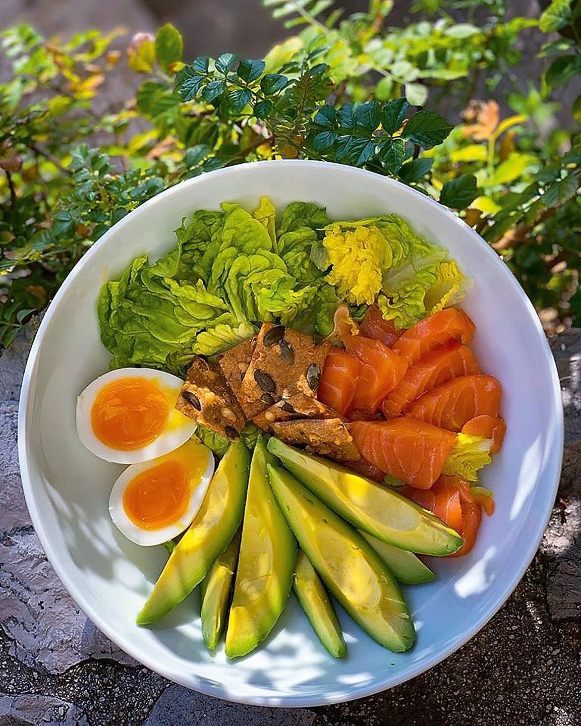 Нам надо: салат (айсберг, или латук, или что вы там зеленое любите), лосось (нежно-соленый или копченый, да и на пару идеально пойдет), авокадо, яйца, тыквенные семечки или крутоны (как у меня).