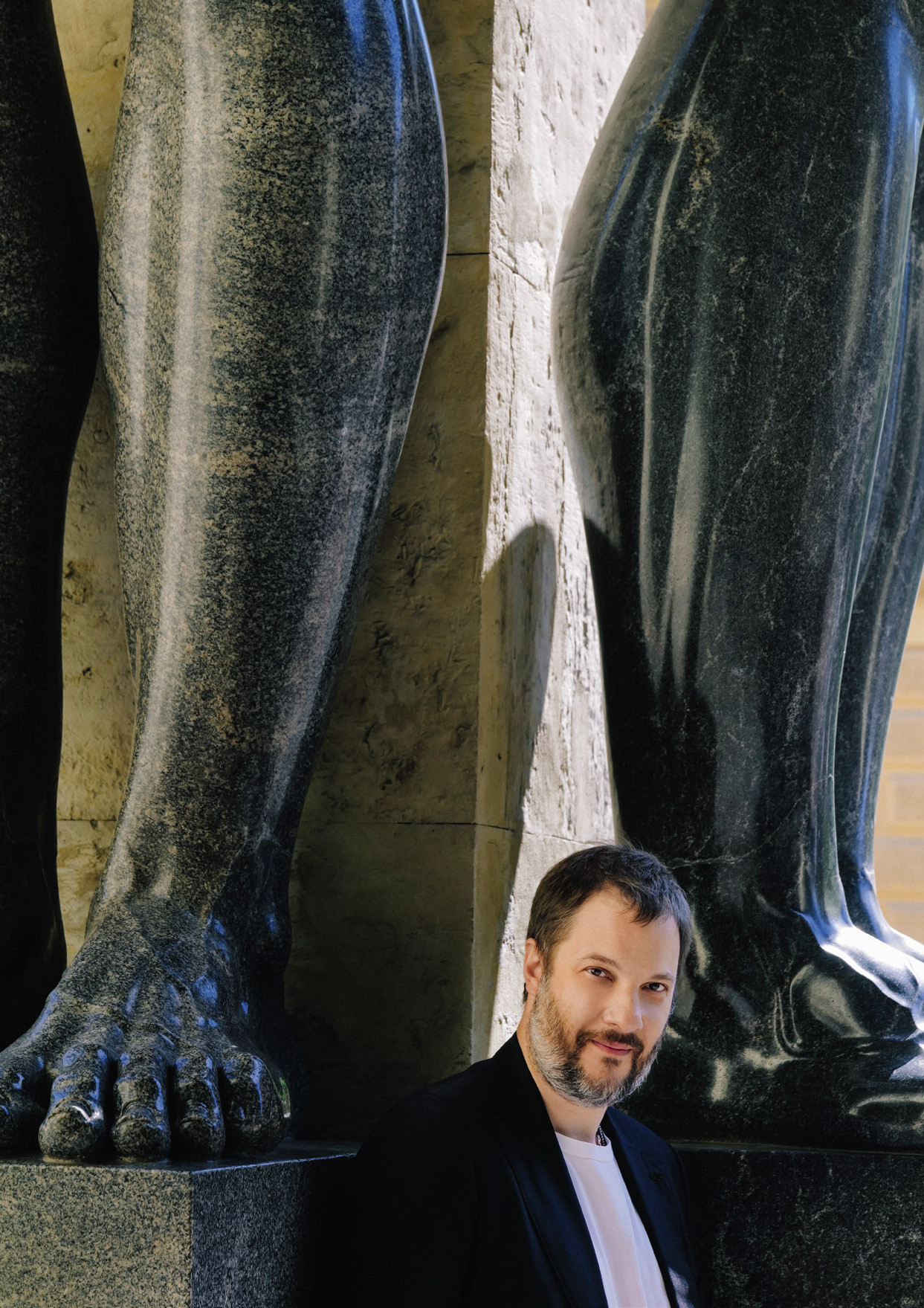 Александр сфотографирован у портика Нового Эрмитажа — у ног знаменитых атлантов, стоящих на постаментах из гранита-рапакиви и поддерживающих архитрав. Ученик Демут-Малиновского, скульптор Теребенев вдохновился фигурами древнегреческого храма Зевса Олимпийского в Акраганте на Сицилии, а 50 каменотесов работали над пятиметровыми гигантами в течение двух лет.