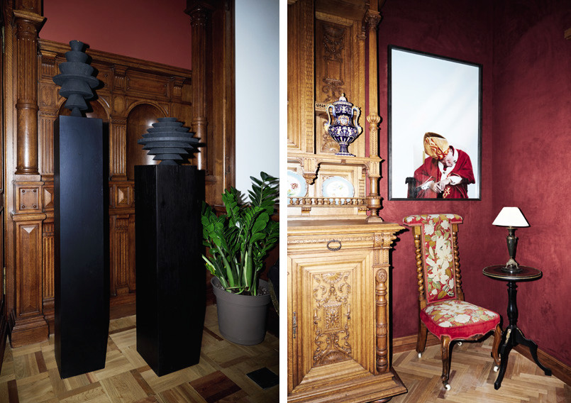 Коллекционер Анна Амосова показывает, как сделать арт плюс фэшн в интерьере: к картинам Сергея Бондарева и Юлдус Бахтиозиной добавить графику Кирилла Челушкина и разместить это все в самом настоящем дворце — бывшей квартире великого князя Георгия Михайловича, первого куратора из семьи Романовых.