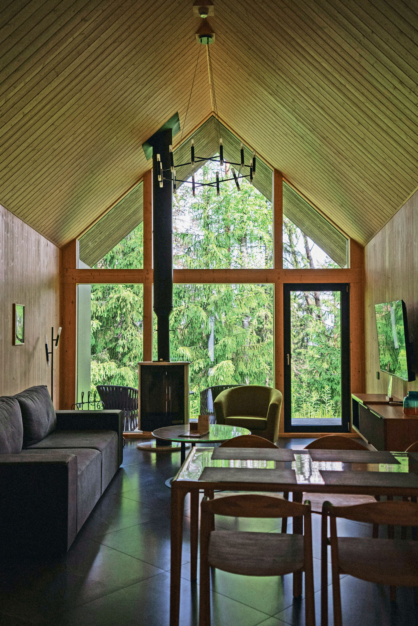 Отель VIEW GA Forest SPA 4*— это капсула перезагрузки и отдыха посреди леса: есть варианты коттеджей с тремя спальнями и кухней, плюс ванная и сауна с панорамным окном (вид на Волочаевское озеро!). А еще ортопедические матрасы, электрические камины, блэкаут-шторы, плейстейшн, караоке и тропический душ. На собственной террасе занимаемся йогой, пилатесом, чиллим на шезлонге, в кресле-качелях или в гидромассажном джакузи под звездами. Гриль-зона — по соседству.