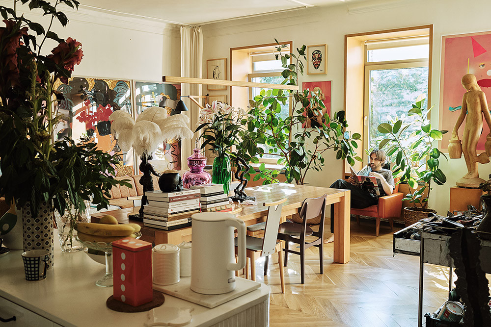 При этом пространство задумано как рама для моей коллекции — и собственных работ, и вещей других художников. Мне было нужно минималистичное решение в скандинавском стиле — доминирующий белый цвет, но оригинальные детали: например, отделка окон панелями из фанеры и шпона, деревянные вставки, таблички из эмали, стеклоблоки, дубовый паркет и плитка-терраццо с мраморными камушками, как это и было принято в советских ДК. Модерновый ковер с символикой московской Олимпиады 1980 года произведен в какой-то из бывших союзных республик и найден, разумеется, на «Авито».