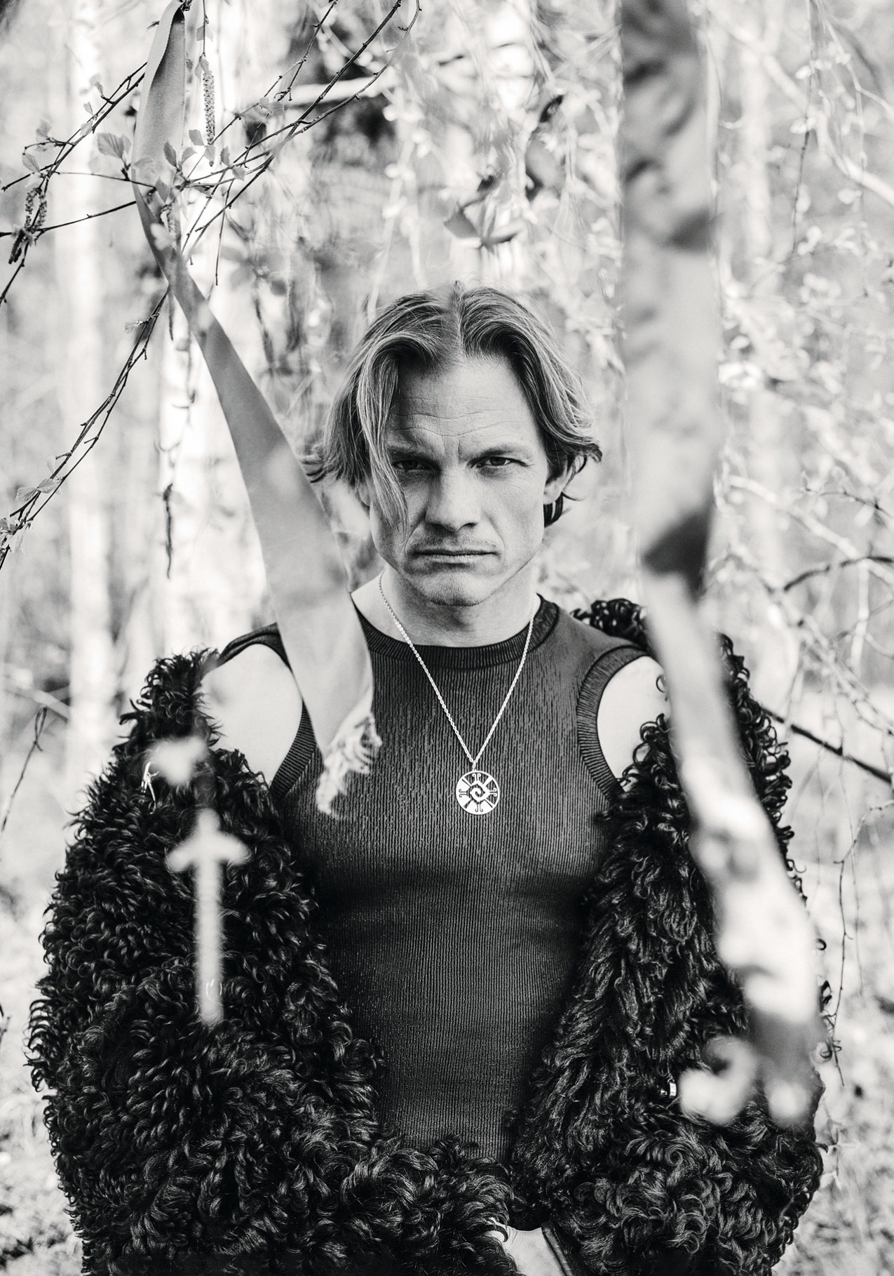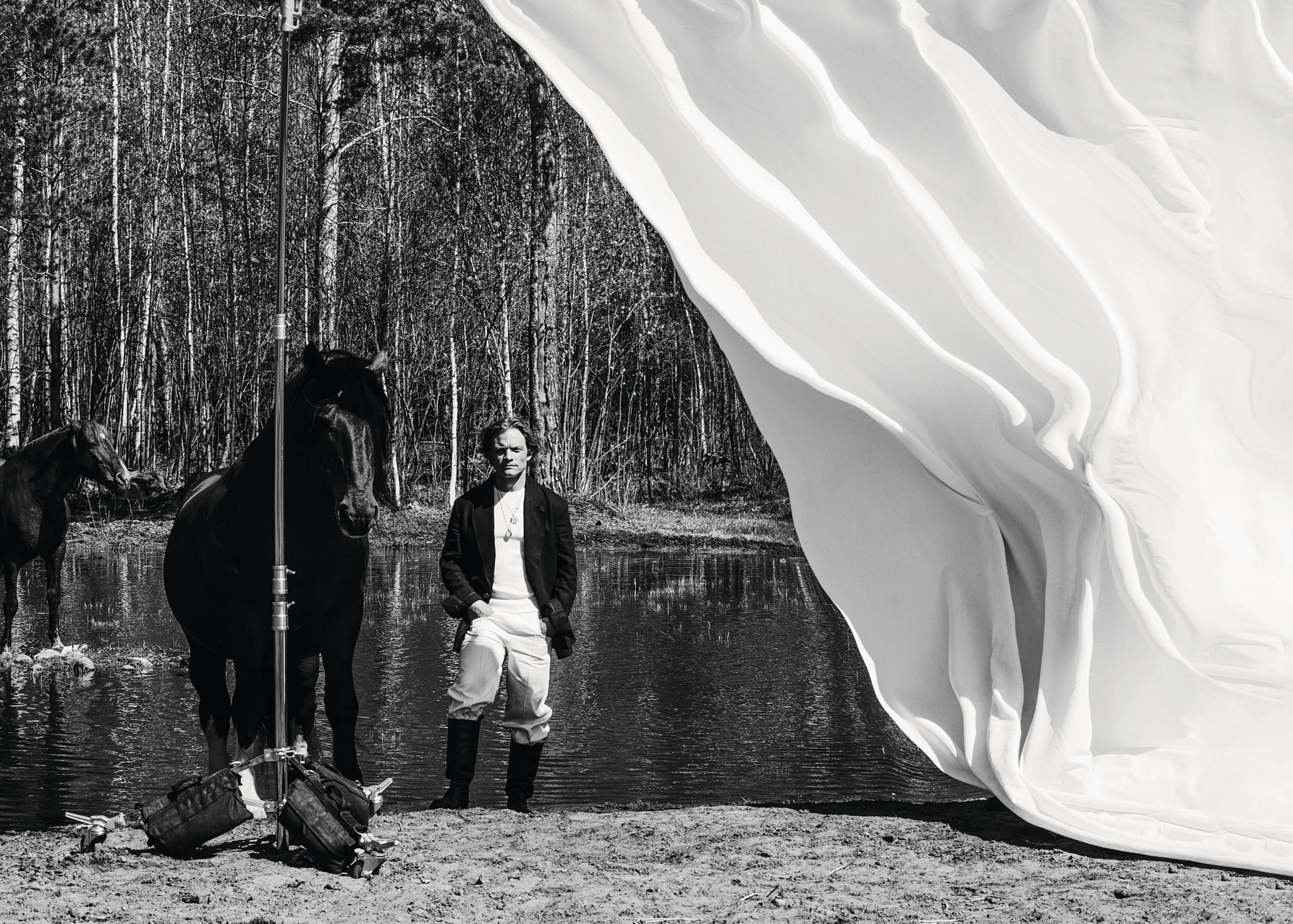 Евгений Ткачук сфотографирован в деревне Лепсари под Петербургом – в созданном им первом в России конном драмтеатре «ВелесО», где наравне с артистами роли в спектаклях исполняют жеребцы Жемчуг и Валдай.