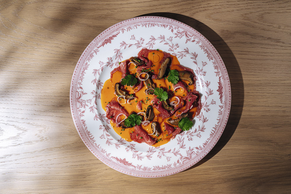 Наш инсайд с проработки: все внимание фокусируем на нарядной еде! Начинаем с атлантической креветки с печеной паприкой, томатом и подкопченной фетой, продолжаем куриным бедром с топинамбуром и кунжутным соусом, а финализируем террином из бычьих хвостов с кремом из баклажана.