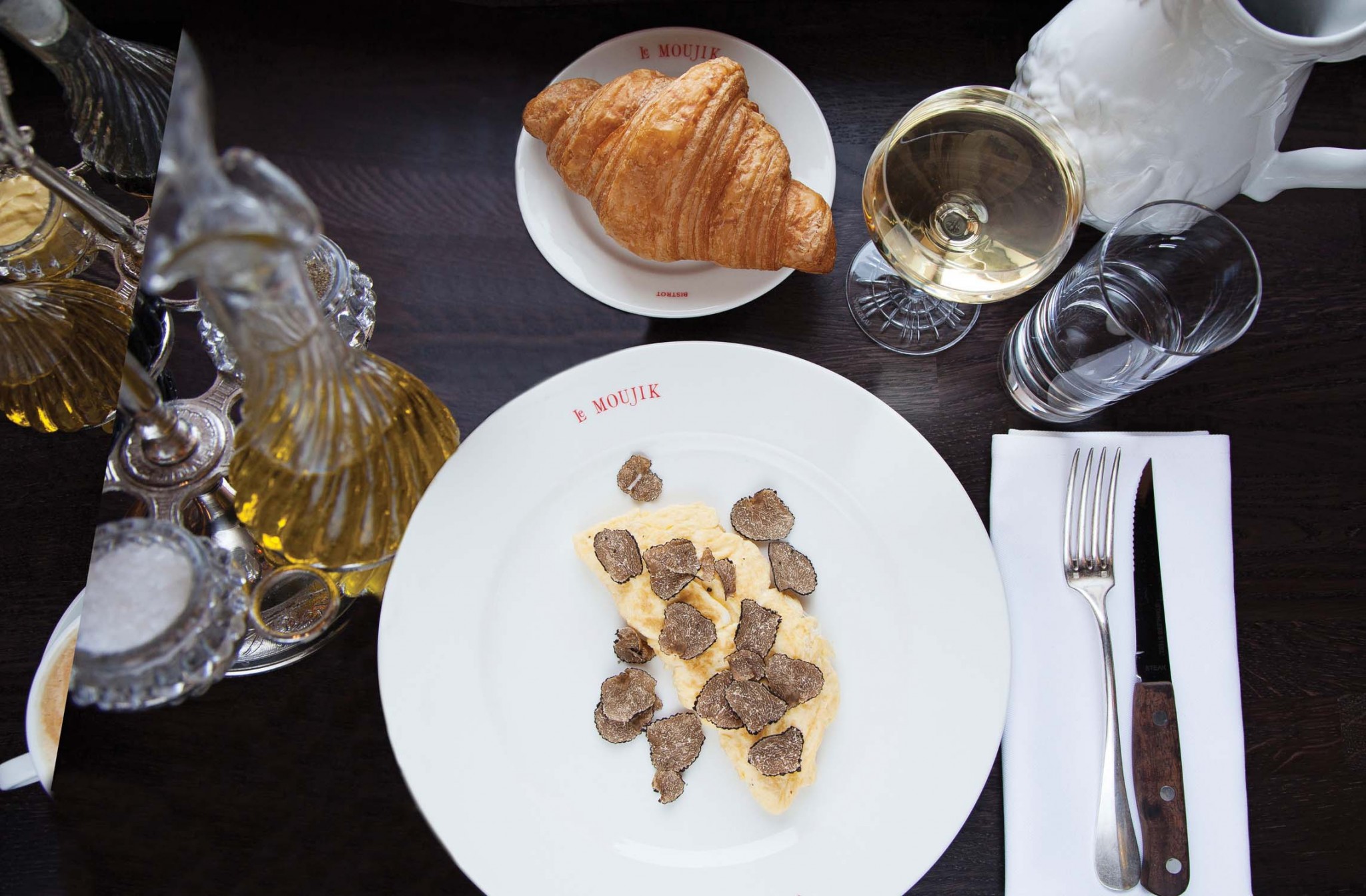 В Le Moujik во французском стиле с вкраплениями русскости в виде глиняных плошек для каш предлагают свежеиспеченные багеты, круассаны и крок-месье (жаль, не собственного производства) и четыре сета с завтраками: несколько простых — с овсянкой, гранолой, яйцами бенедикт и один великосветский — омлет с черным трюфелем и икрой (разумеется, черной) под бокал игристого гран крю. Здесь два зала: первый — бар с высокими столиками и винами как от небольших семейных хозяйств, так и из шато премьер и гран крю под артишоки, паштеты, устрицы и оливки; второй — ресторан с меню в духе французской классики. Утиную грудку жарят с персиками; ножку ягненка подают с чечевицей и готовят беф бургиньон — тушенную в красном вине говядину. Главный на кухне — Руслан Агейченко, который со всем французским на короткой ноге: повар десять лет шефствовал в Entree у Никольского собора, открывал филиал на Бакунина, стажировался во французских гастрошколах на тему фуа-гра и моллюсков и работал в петербургских заведениях Real Authentic Wine. За антиквариат, картины и скульптуру бульдога в честь собачек Ива Сен-Лорана отвечает легендарный Михаил Бархин, c которым Эдуард Мурадян запускал и «Москву», и «Коровабар», и камерный «ЕМ».