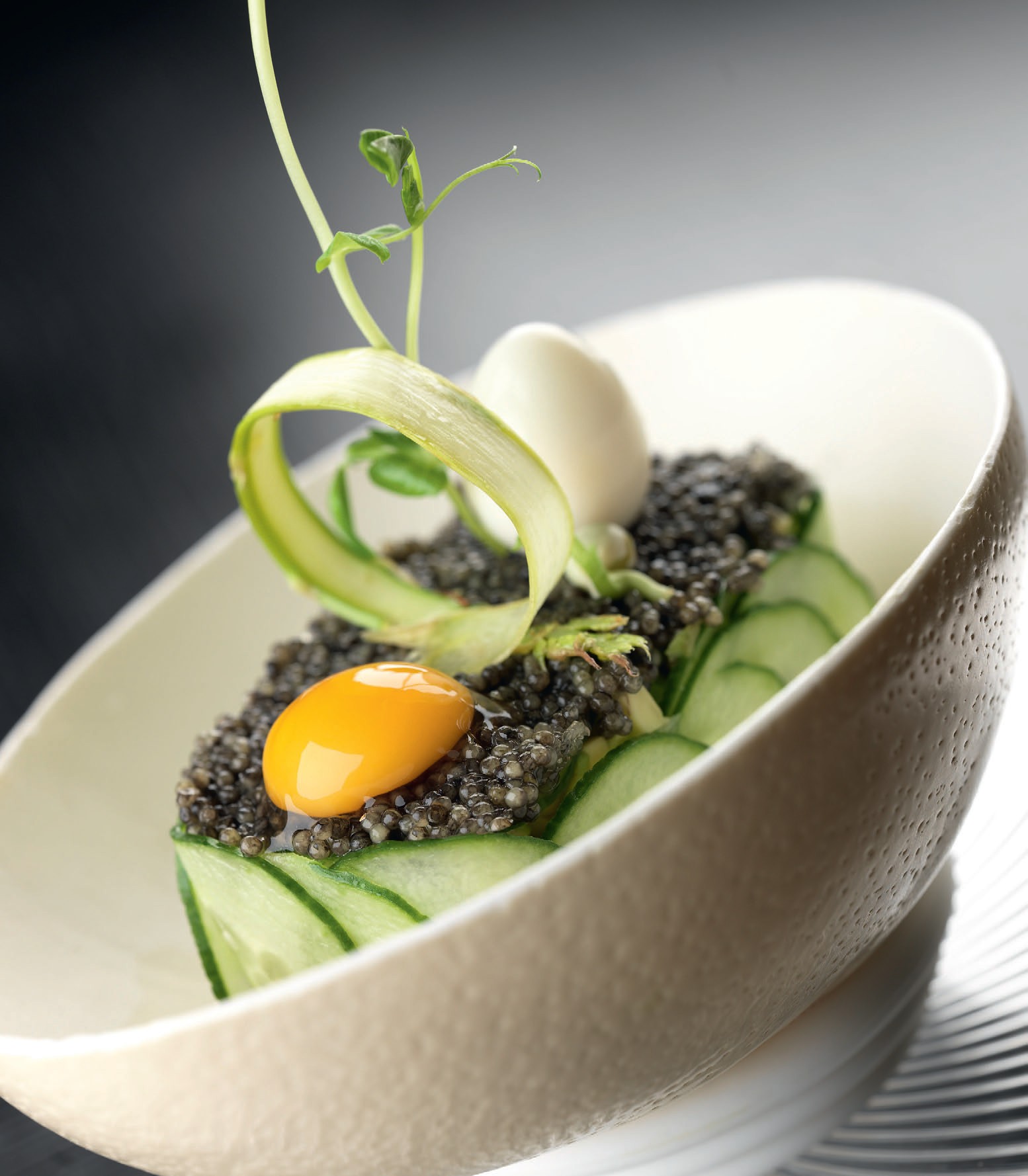Слегка потемневший от времени белый мрамор, плафон в стиле ар-деко над головой, массивные деревянные столы и вальяжные бархатные кресла — в интерьерах «Икорного бара» нет никаких сюрпризов, и это хорошо. От заведения с полуторавековой историей ждешь именно такой предсказуемости. В центре меню — также ожидаемо — стоит внушительный набор икры. Есть и ценнейшая (самая дорогая, безусловно) икра белуги, и целых пять видов осетровой, икра стерляди-альбиноса, редчайшая икра бестера — выведенного в советское время гибрида белуги и стерляди, рыбы, по вкусовым качествам близкой к наиболее деликатесной белуге, но растущей и созревающей к нересту куда быстрее — как это делает стерлядь. Есть, разумеется, и щучья, и лососевая икра, и астраханская паюсная — то есть прессованная, консистенции пастилы, — что удивительно, довольно редкая сейчас, несмотря на свою куда более низкую, чем у зернистой икры, цену.
