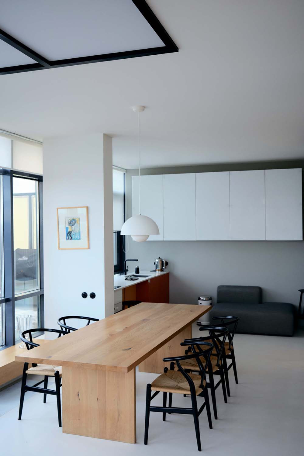 Медиахудожники и основатели агентства Illuminarium3000 Евгения Годунова и Юрий Пелин не стали завешивать свою квартиру на Выборгской стороне NFT-панелями и мэппинг-проекциями, но от конструкции уникального потолочного фонаря для светотерапии не удержались. Авангард и последний писк моды они предпочитают носить на себе, коллекционируя редкие подиумные луки Comme Des Garçons и Simone Rocha, а вот в интерьере остановились на минимализме и функциональности.
