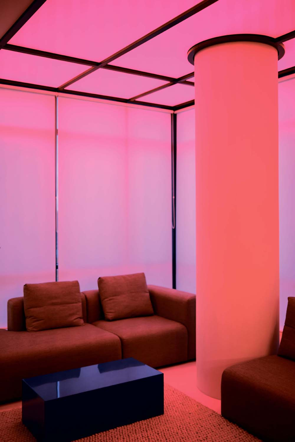 Юрий: Именно так. Пожалуй, этот фонарь — наш самый мощный, дорогой и сложнореализуемый арт-проект. (Смеется.) Мы сами его спроектировали и собирали буквально по частям — нет в России компании, которой можно было бы заказать что-то подобное. Получилась коллаборация мастеров с нами во главе. Кто-то делал металлические перекрытия, кто-то наполнение, кто-то световые настройки, а мы всё это собирали почти кустарным способом. Он работает так — в потолке установлены светодиодные лампы, которые могут менять цвет по всему спектру радуги, а управляется все это через пульт. Фонарь — главный акцент всего интерьера. Наша с Женей компания инновационного дизайна Illuminarium3000 лоббирует то, что каждый с помощью света и цвета может изменить пространство. Мы многократно опробовали этот прием в своих работах — архитектурных сценических декорациях и видеоинсталляциях для концертов и презентаций, при создании 3D-проекций и световых шоу. И на основе всего этого опыта скажем вот что: не нужно, как дураку, двигать тяжеленную мебель, если ты