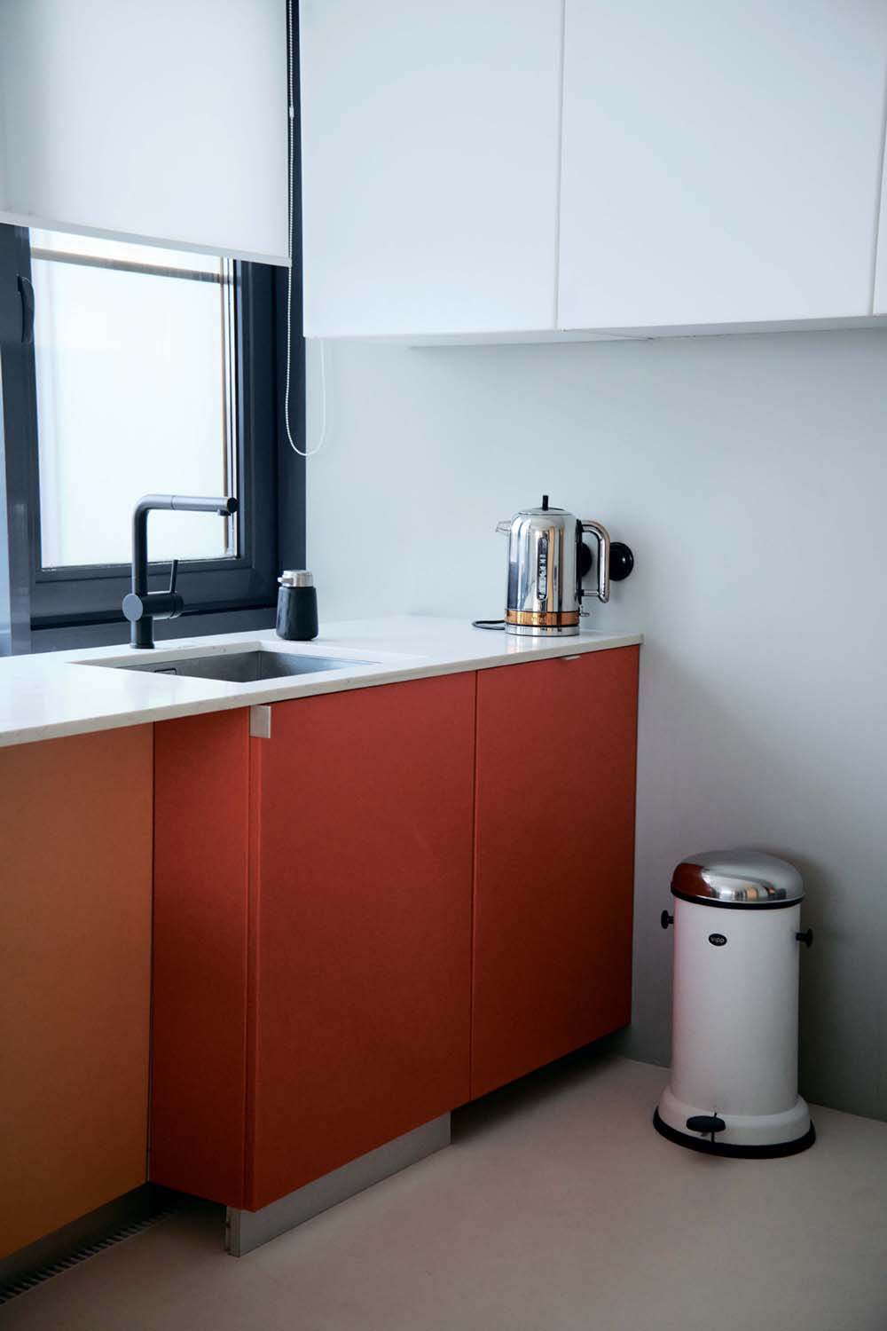 Евгения: Мы задались целью использовать пространство максимально функционально, чтобы в нем работал буквально каждый сантиметр. Динамику задала анфиладная планировка: прихожая перетекает в зону ванной и кухни, кухня — в гостиную и нашу спальню, гостиная — в детские, а детские — снова в прихожую. Нам нужен был объединяющий все эти пространства элемент, и им стал белый пол. Класть дорогое дерево, когда у нас трое детей, показалось довольно глупой идеей, поэтому мы остановились на молочного цвета резиновом наливном покрытии. А уже к нему подбирали все остальное: спокойные оттенки серого и бежевого, а также натуральные материалы вроде дуба и мрамора. Из ярких акцентов у нас в квартире только алый кухонный шкаф датской компании Reform. Помимо минималистичного дизайна, Reform славится коллекциями приглашенных дизайнеров, например, архитектора Жана Нувеля. Наш фасад Match — авторства бельгийского семейного дуэта Muller Van Severen.