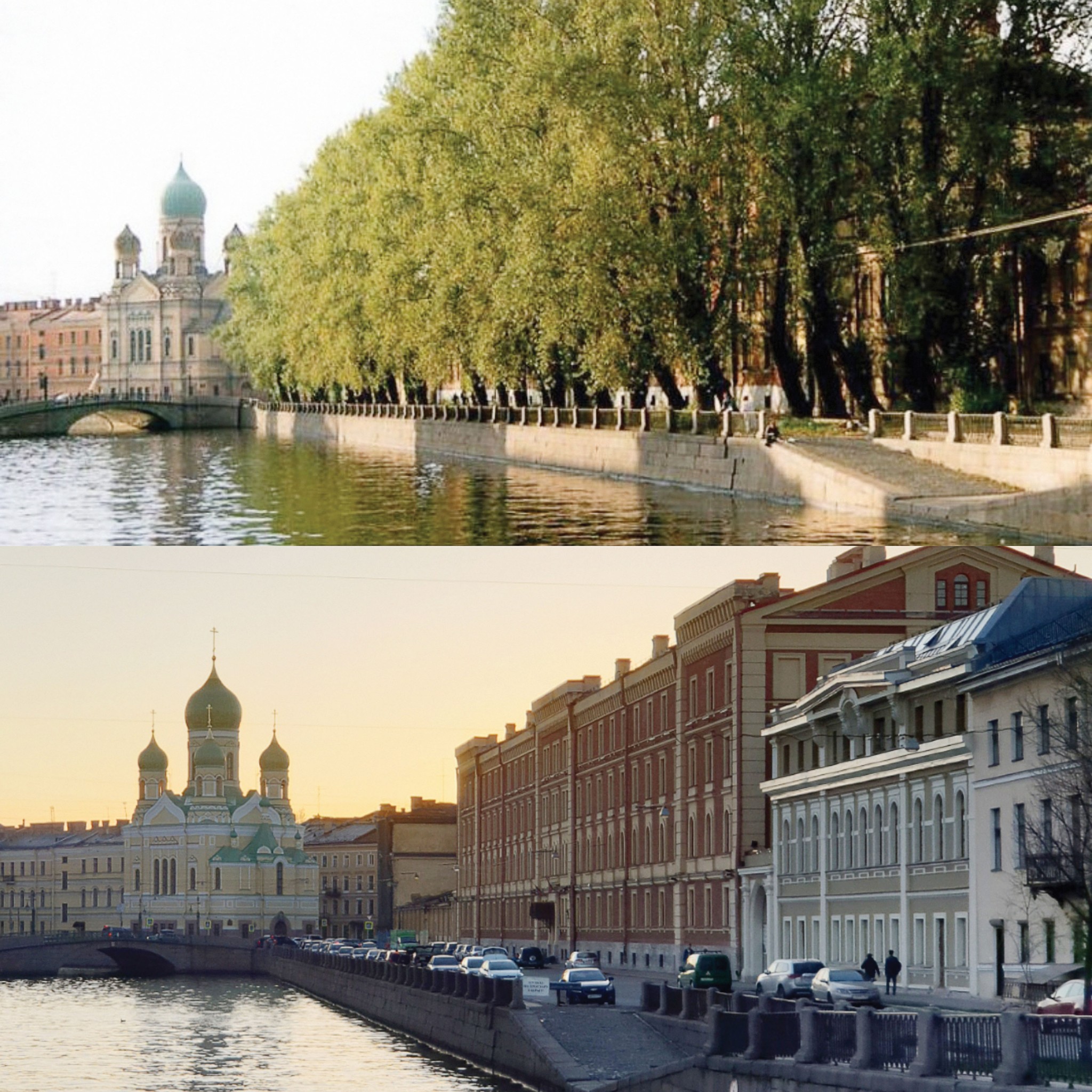 Набережная канала Грибоедова у Свято-Исидоровский церкви в 2000-е годы и сегодня.
