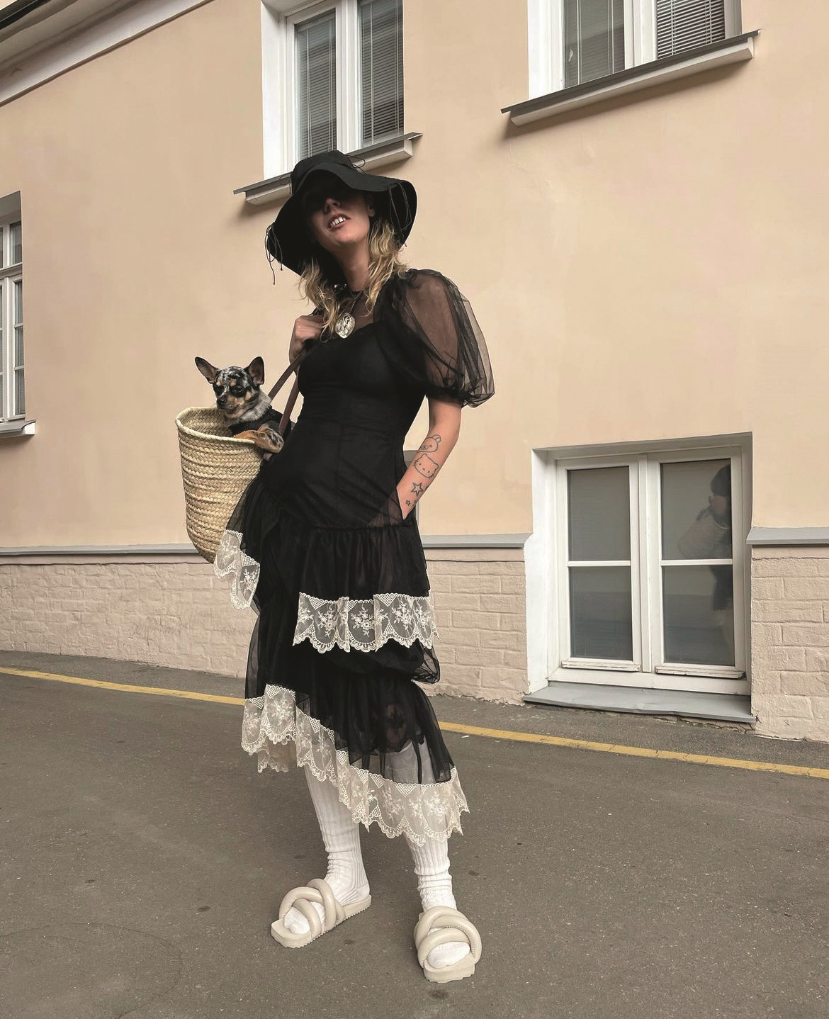 Экспериментировала с дизайном одежды с детства, слово за слово — в магистратуре «Вышки» написала диссер по коммуникациям фэшн-брендов (и роли ностальгии в них). Стилизовала ежегодные взрывные кампании с Belik, выходы Юлии Снигирь в период сотрудничества с Cartier и последний кампейн Jackson de Ville (где помпоновые Барби и готические русалки). Теперь работает с инфлюенсером Юлией Годуновой и на телевидении под руководством Софьи Эрнст (подробности держит в тайне), а еще ожидает выхода фантазийной истории с певицей Дорой. «Важно следить за границами и работать с людьми, которые вам симпатичны (и это взаимно)».