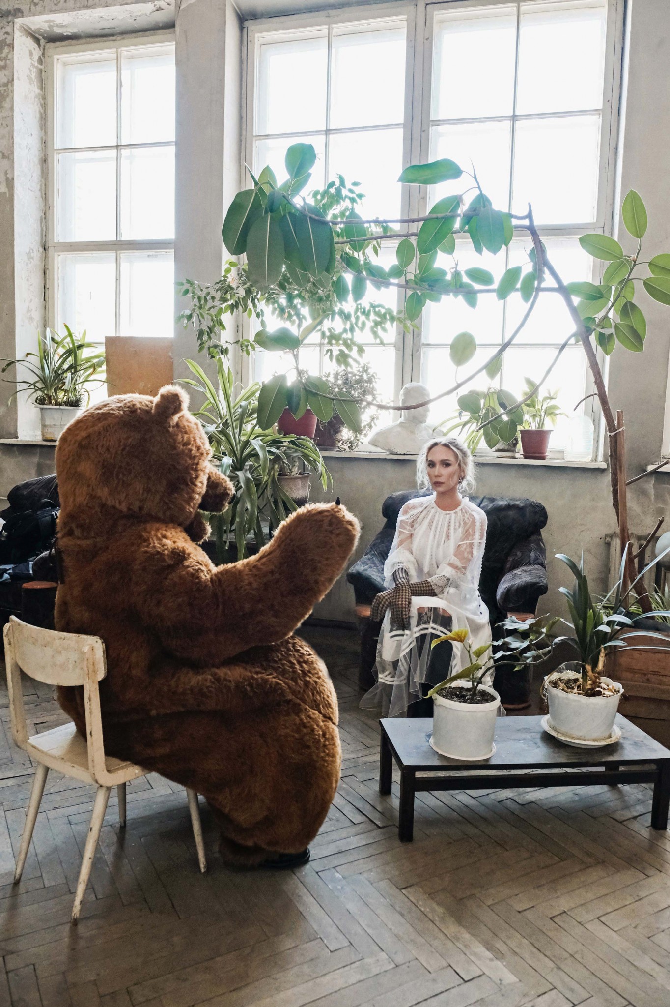 Да, Екатерина Смольникова — сооснователь благотворительной инициативы Play and Help, жена защитника «Зенита» и коллекционер современного русского искусства. Но только когда мы узнали, что Катя выросла под сенью «Родины-матери» на волжских берегах, а первым лотом в ее собрании стал «Медведь» Майофиса, у нас все сложилось. Директор отдела моды Ксения Гощицкая отправилась выяснить, как вышло, что коллекция Смольниковых уже не помещается в квадраты жилой площади, а узнала про духовные поиски и бабушку Нину Сергеевну.