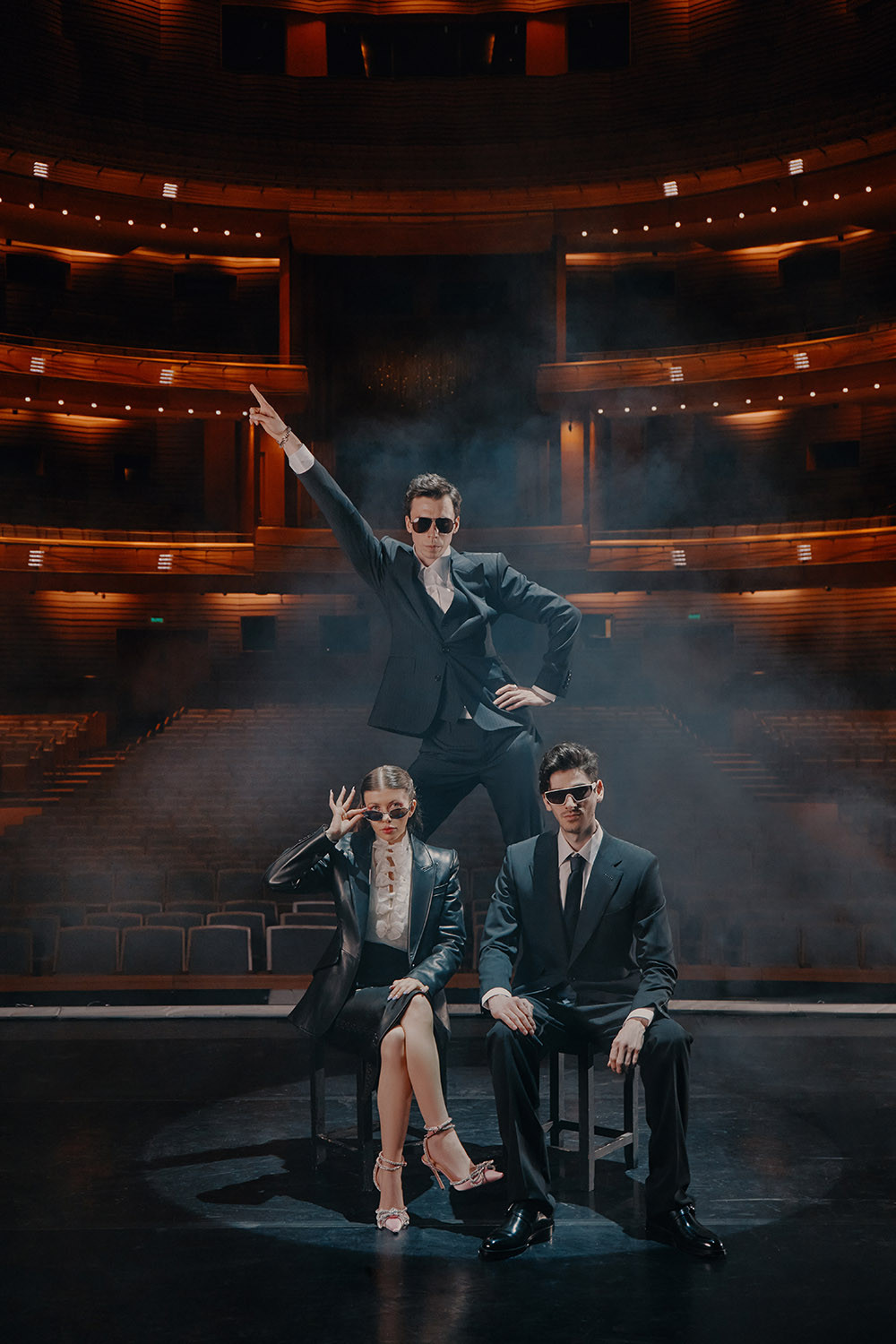 На Юлдус: пиджак и юбка Alexander McQueen, рубашка Zimmerman, туфли Mach & Mach, очки Balenciaga (все — ДЛТ). На Косте: пиджак, брюки и рубашка Tom Ford, галстук Canali, дерби Dolce & Gabbana, очки Celine (все — ДЛТ). На Максиме: пиджак, жилет и брюки Dolce & Gabbana, рубашка Tom Ford, очки Balenciaga (все — ДЛТ)