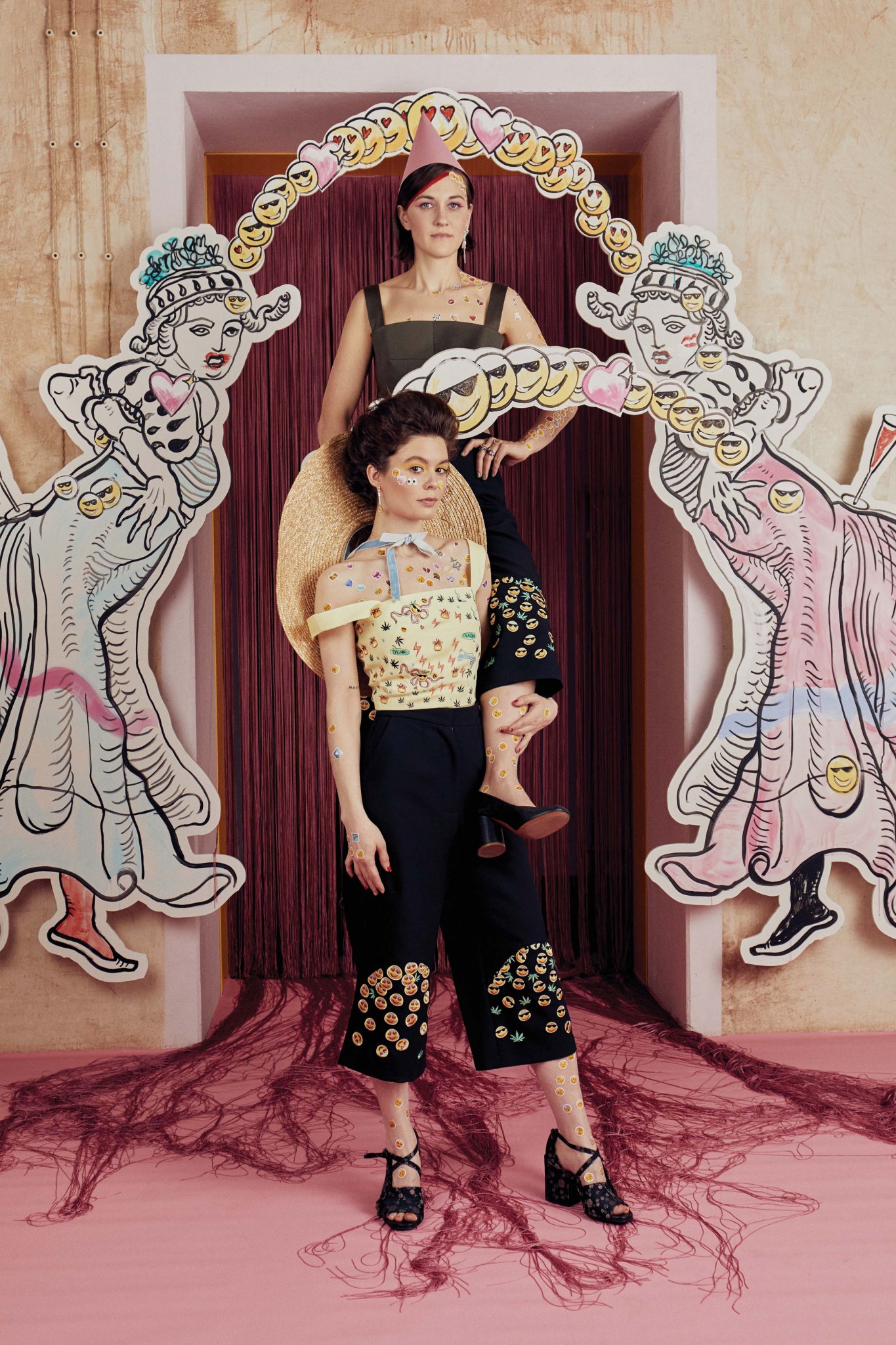 Мы обожаем тенденцию «арт плюс фэшн» за возможность превратить себя в обжедар. Отучившись в London College of Fashion, Ольга Гинзбург открыла концепт-стор Ola Ola и пригласила в соавторы своей летней коллекции художницу Данини. Да, правнучку того самого придворного архитектора Николая II! Она сделала сюрреалистичные вышивки и принты, которые сочетают барочность, глитч и сбой реальности — как цифровой, так и обычной. Смайлики, эмодзи