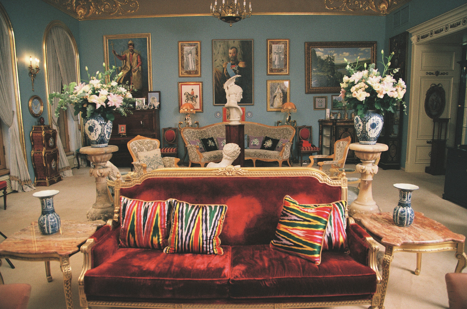 Мне всегда казалось, что сине-голубой — очень петербургский цвет. Потом я заменил массивные хрустальные люстры на ампирные, зеркала на росписи, а в буфетной теперь копия плафона из версальского Трианона — ее выполнили студенты Академии художеств. В нишах гостиной я устроил что-то вроде альковов и затянул их тканью «Жар-птица» бренда Tissus Tartares дизайнера Ольги Томпсон — она производит их методом ручной печати на фабрике во Франции. Декоратор Альбина Назимова посоветовала повесить между нишами большое зеркало — его я нашел в антикварном магазинчике недалеко от Апраксина двора и покрасил золотой краской. Лампы купил на блошином рынке в Лионе, в Стамбуле — ткань икат и сделал из нее абажуры. Еще две лампы — мейсенский фарфор 1950-х годов.