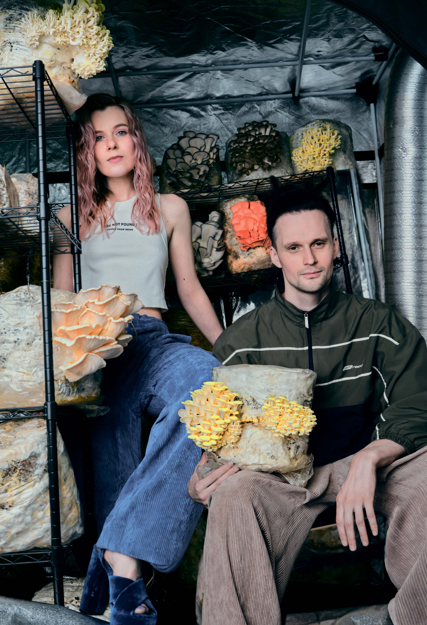 Прародители космических грибов Аня Ильвер и Кирилл Аксенов c «букетом» хрупких лимонных вешенок. На Ане: топ и брюки 404 Not Found, босоножки Miu Miu (Pif Paf Supershop). На Кирилле: брюки 404 Not Found, ветровка Reebok (Sneakers Museum)