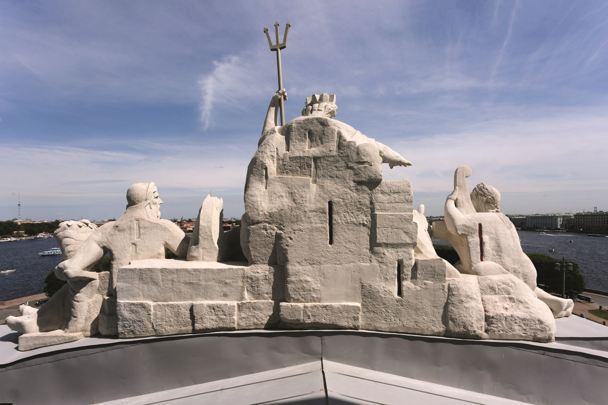 Сегодня зданию Биржи под опекой Эрмитажа возвращают былое великолепие: серо-голубой исторический цвет, ступени из гранита рапакиви и статуи морских божеств Жозефа Камберлена. Отремонтировали кровлю: родные сосновые стропила, которым 207 лет, уцелели. Еще предстоит отреставрировать интерьеры и заменить внутренние коммуникации. После завершения работ в памятнике классицизма откроют Музей геральдики. Ждем с нетерпением!