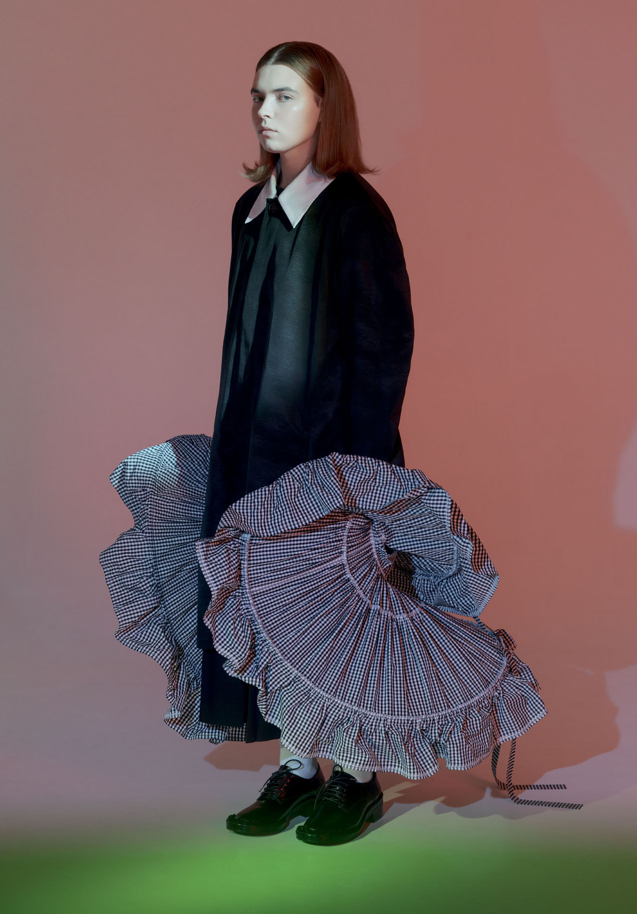 Фэшн-вундеркинд и ученик фаундера Inshade Марии Смирновой в Школе дизайна НИУ ВШЭ Роман Зимогорский провозгласил female rage (легитимизируем женскую ярость!) сверхмодным вайбом. Роман начинал с пошива платьев-паучих (оммаж скульптурам Луиз Буржуа!), лакированных стейтмент-футляров и гипертурнюров, покоривших готическую диву Вику Салават (носила их на Неделе моды в Париже и стилизовала для эдиториала португальского Vogue!). Для конкурса Собака.ru «Новые имена в моде» сочинил авангардистские наряды-топоры (power curve четвертой волны феминизма!) и кукольные мини по мотивам хорроров джалло (носит принцесса винтажа Лиза Гусевская!). А на выпускном показе нарядил Мусю Тотибадзе в ионическое платье-бигуди. Главная фэшн-суперсила Зимогорского: непринужденно мешает герли-эстетику с ужастиками и может выразить любую эмоцию с помощью клетки виши.