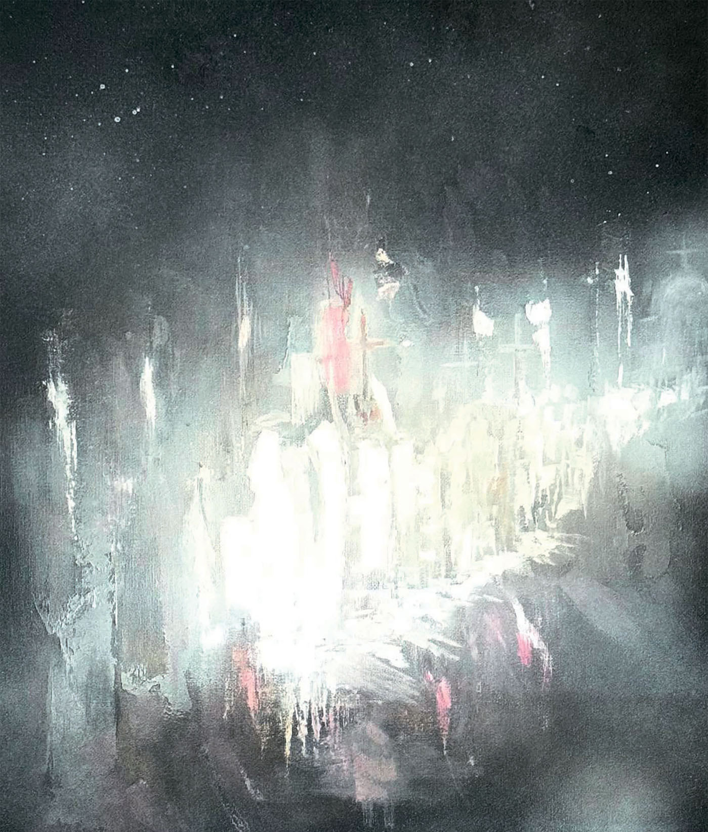 Я долго искала свое медиа, пока однажды не увидела в интернете работы, написанные углем. Я тут же заказала себе гору материалов. Теперь МОИ ИНСТРУМЕНТЫ — УГОЛЬ И АЭРОЗОЛЬНЫЕ БАЛЛОНЧИКИ, реже берусь за масло и акварель. Я опираюсь на визуальное и чувственное восприятие мира. В арт-комьюнити я попала так: у меня было несколько готовых работ, и я попросила свою подругу Мотю Ларионову посмотреть на них и посоветовать, где их можно было бы показать, — она стажировалась в Joy Gallery и разбирается в этой сфере. Мотя познакомила меня с идеологом творческого объединения «Дилетанты» Иванкой, и меня взяли на их первую поп-ап-выставку молодых художников, где сразу продались несколько моих картин. Меня абсолютно захватили энергия и энтузиазм этого комьюнити, и я точно поняла, что буду заниматься искусством.