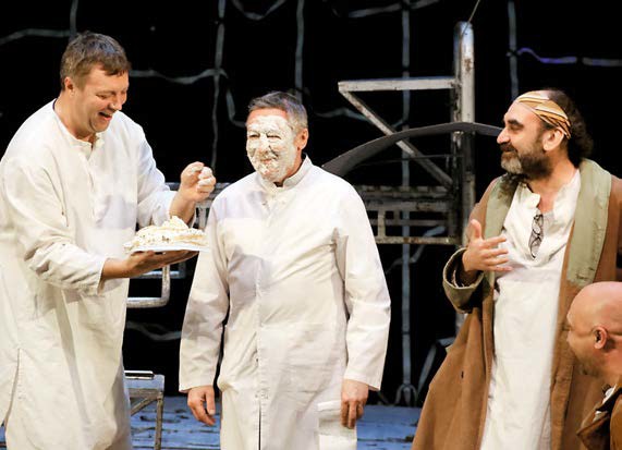 Коллеги креативно подошли к поздравлению Михаила Ефремова с 55-летием. Накануне юбилея мэтр играл в спектакле «Чапаев и Пустота», где исполняет роль главврача психбольницы и легендарного командира. Прямо во время действия актер Павел Сборщиков незаметно вынес на сцену торт и запустил им в лицо именинника. Тот «подарком» явно остался доволен.