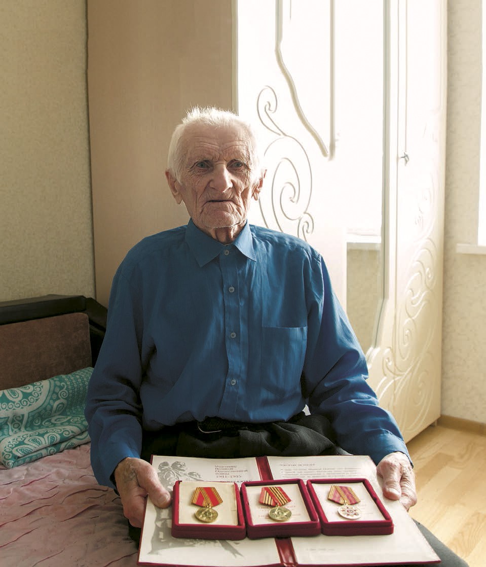 Его призвали в армию в октябре 1944 года – в семнадцать лет. Служил в пехоте на Дальнем Востоке. «Несколько месяцев добирались на другой конец страны, – вспоминает дедушка. – За это время нас всего три раза покормили горячим, в основном ели сухари. Солдаты были так истощены, что падали от изнеможения. Но надо было воевать, и все шли… В боях рядом разрывались мины, моих товарищей поубивало, а я остался жив. Работал связистом до 1952 года».
