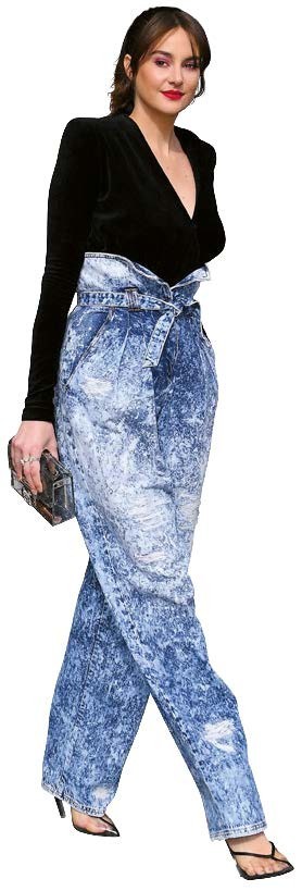 2. Высокая посадка вновь актуальна. Однако лишь недавно модницы поняли, как правильно носить такой фасон. Советуем надевать наверх что-то облегающее, например, водолазку или боди. Вариант для теплой погоды – кроп-топ или