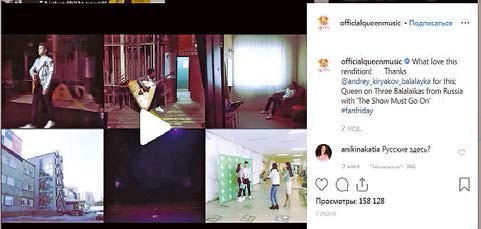 Музыкант Андрей Киряков сделал кавер, сыграв на трех балалайках, на известную композицию The Show Must Go On легендарного британского коллектива и выложил в Cеть. Видео заметили сами артисты и репостнули у себя на странице, подписав: «Какое отличное исполнение!»